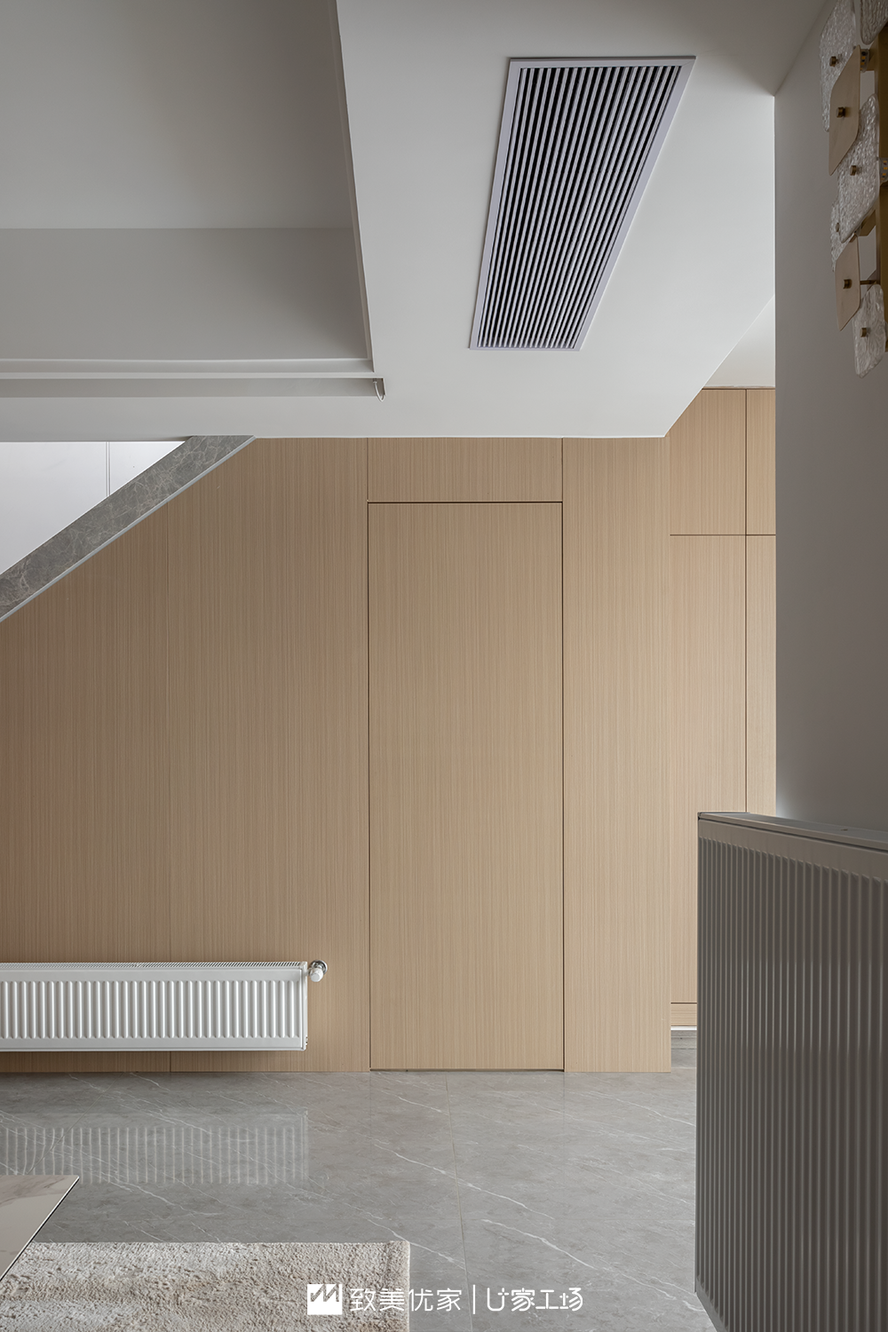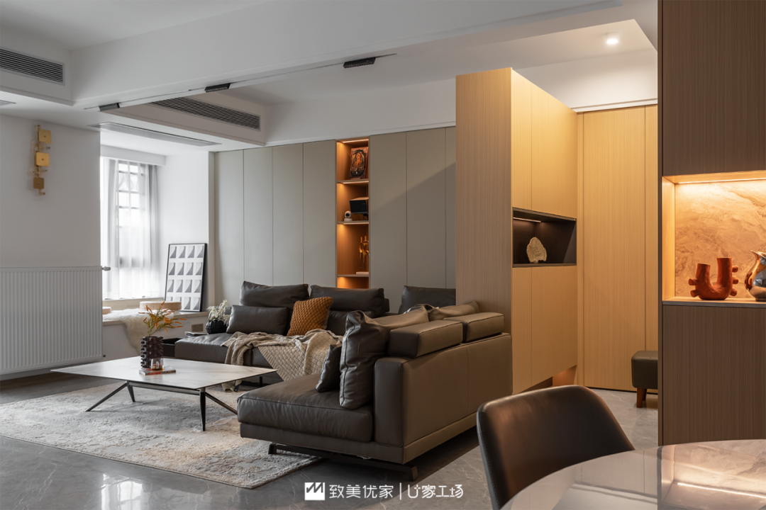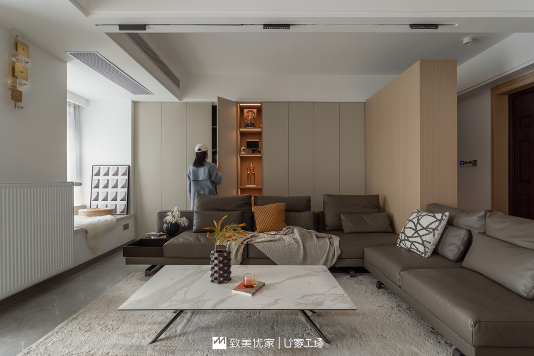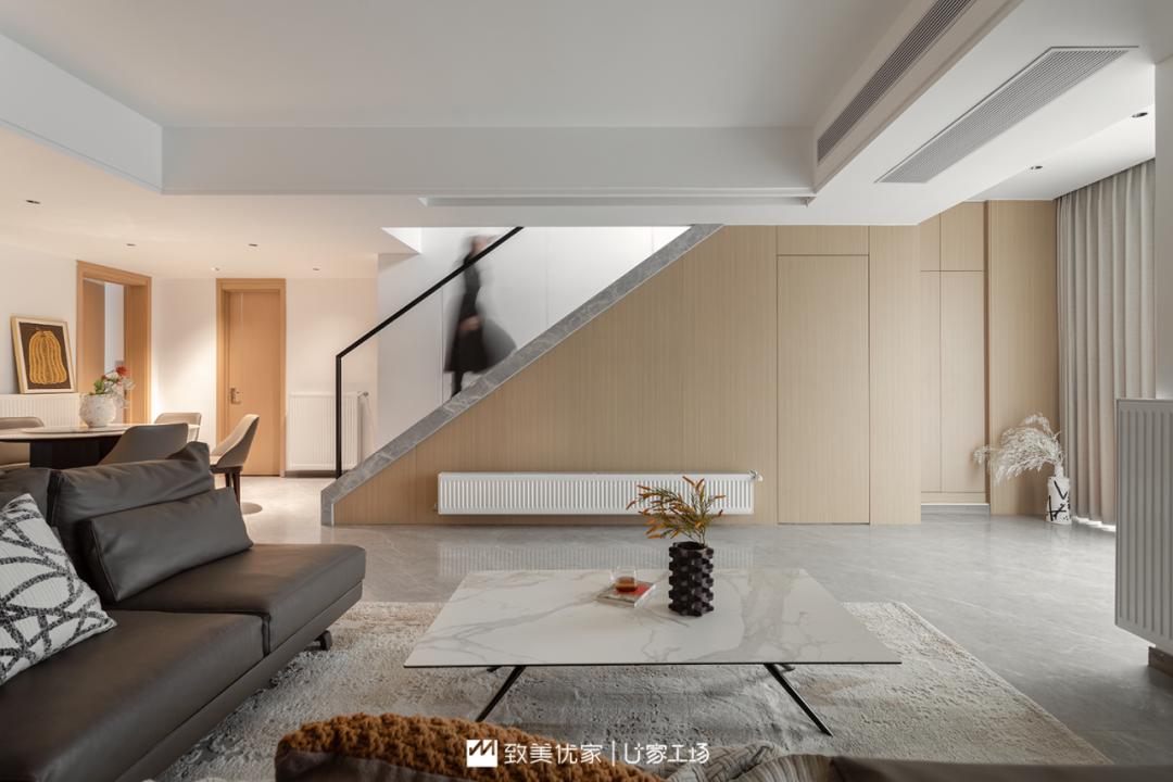 客厅比较大的改动是改变了楼梯的位置,拆除原始楼梯移到客厅对面,定制成了整面墙收纳+展示柜体,一门到顶超高颜值超强收纳。