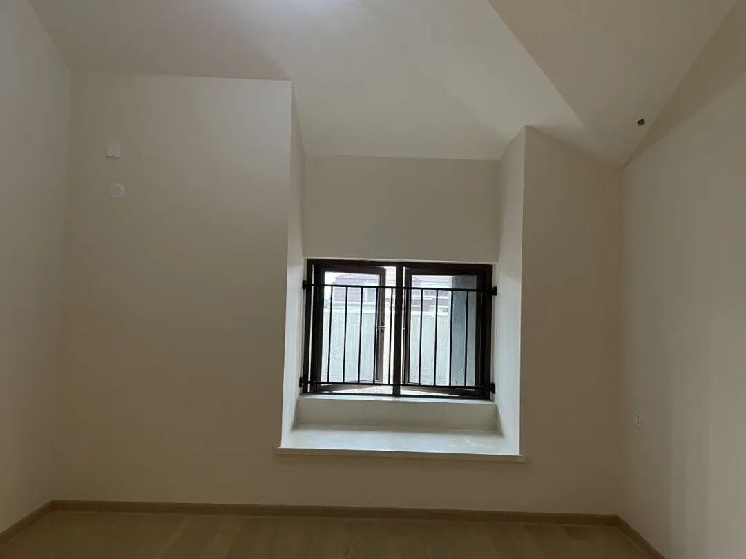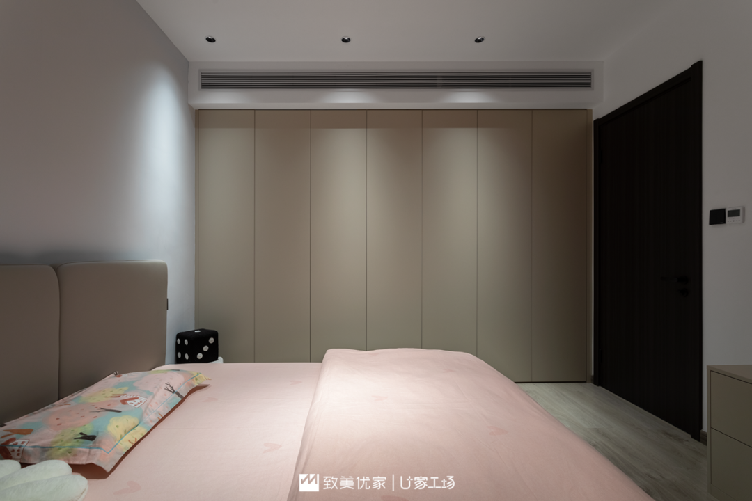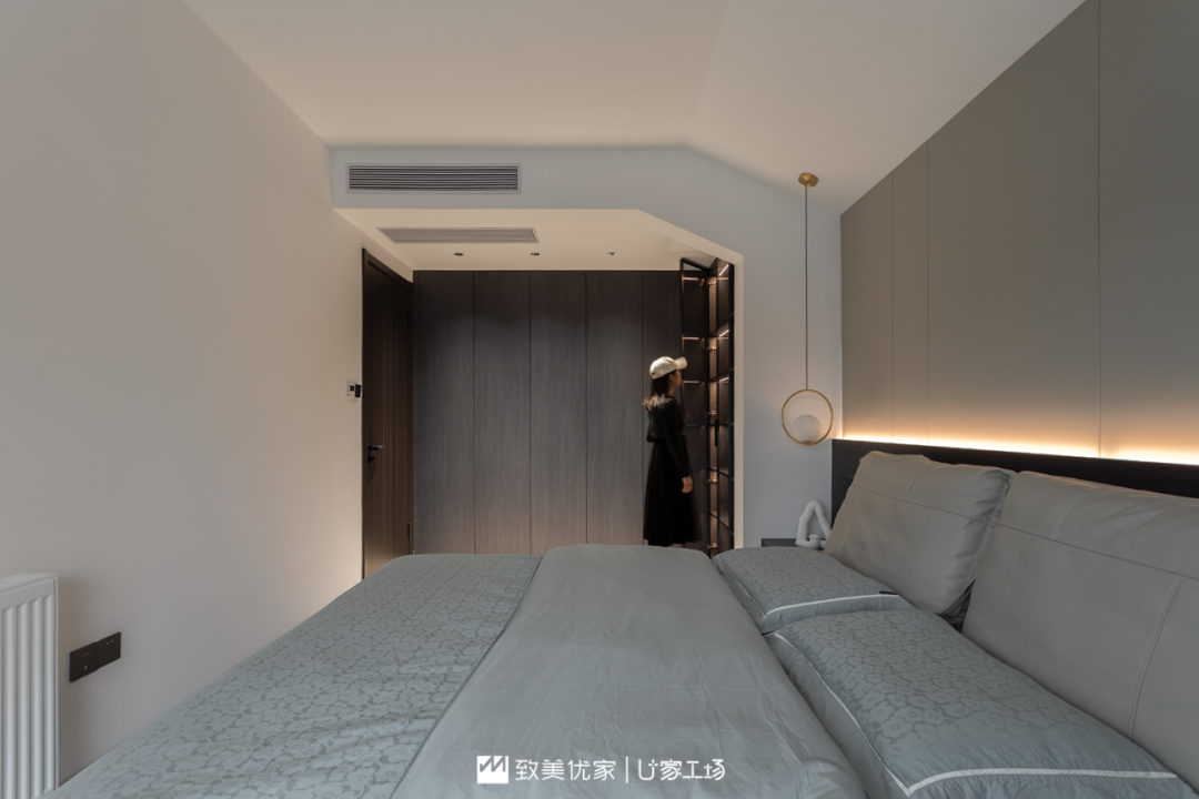 推开门来到主卧,原始主卧的楼顶简直可以叫做“钻石”楼顶了,非常异形,是典型的坡顶造型,设计师利用原始的坡顶进行了无主灯设计,并把睡眠区和衣柜区进行合理分区,改造后的主卧看起来有着特别的屋顶造型,又不显得突兀。