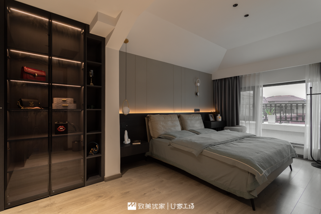 一侧便是L形的转角衣柜,一面是衣柜一面是黑色玻璃柜,可以收纳日常衣物,放置女主人的包包等,收纳和展示功能都同时兼备。