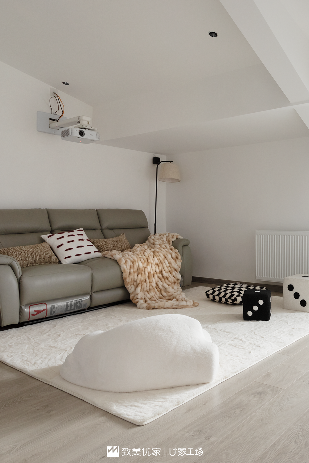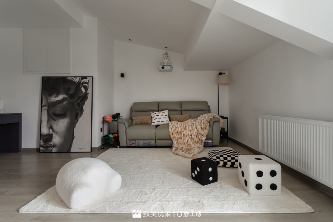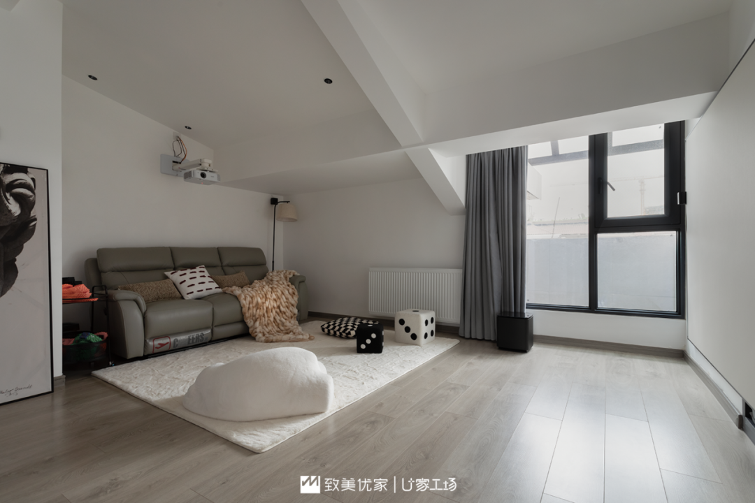 改造后的2楼不仅满足了两个卧室的需求,还独立出来一个超大的影音室,由于父母喜欢看电影和K歌,这个空间便天然的成为了娱乐休闲空间,在特别的交叉屋顶下,挂放着投影,能够想象两位老人在这里K歌开心的样子,有朋友来了也可以邀来一起娱乐,或是摆张桌子打打麻将,成都人的老年生活就是这样美好啊~