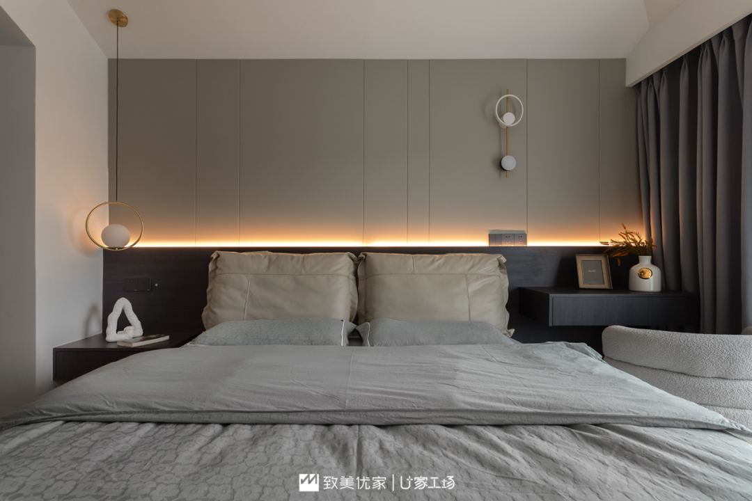 主卧背景墙采用不对称的护墙板进行拼接而成,配上灯带和床头吊灯,温馨舒适的格调便铺展开来,床头柜和化妆柜进行统一定制,悬空式的设计节省了一部分空间,美观度也更高。