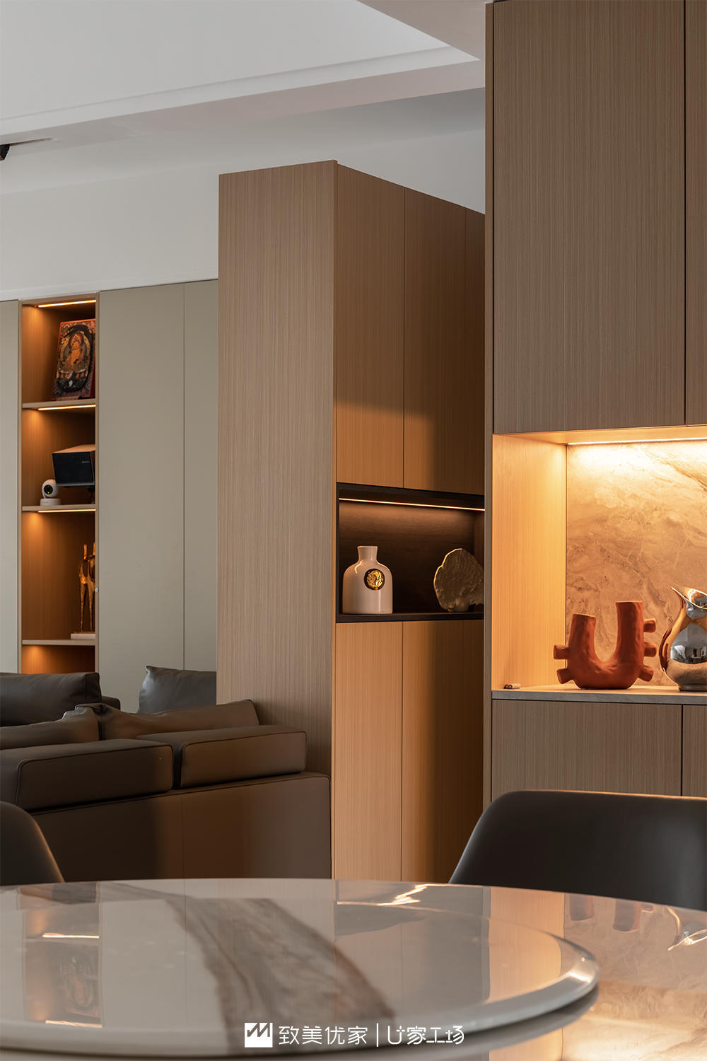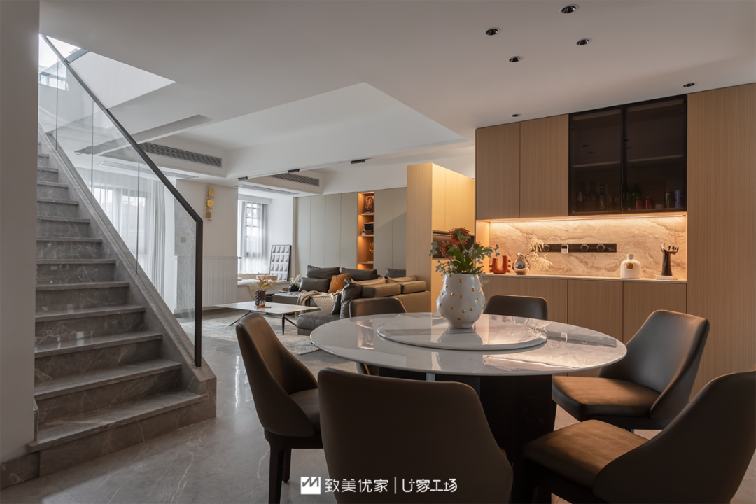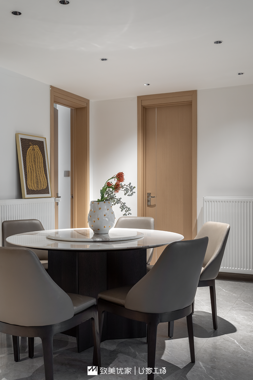 转身来到餐厅,圆形的餐桌非常适合一家六口人一起用餐,餐桌一旁也是整面墙的餐边柜,中间的开放格可以放置小家电,玻璃展示柜里可以放置收藏的好酒。一到周末,女儿一家人回来,便可和父母在客厅里一起互动交流看电影,一起聚餐,家的日常美好便是如此了。