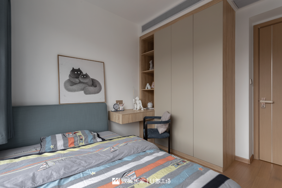 一楼大的卧室留给老人居住,另一个房间是孙儿的房间,为了同时满足睡眠学习和收纳,床靠墙进行放置,一旁是衣柜和书桌的一体化定制,在小空间里实现了更多功能。
