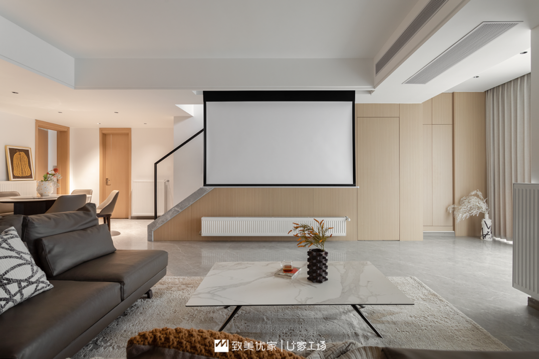 ❸ 把楼梯移到客厅对面可作为投影墙,并在楼梯下面进行超大储物间打造。