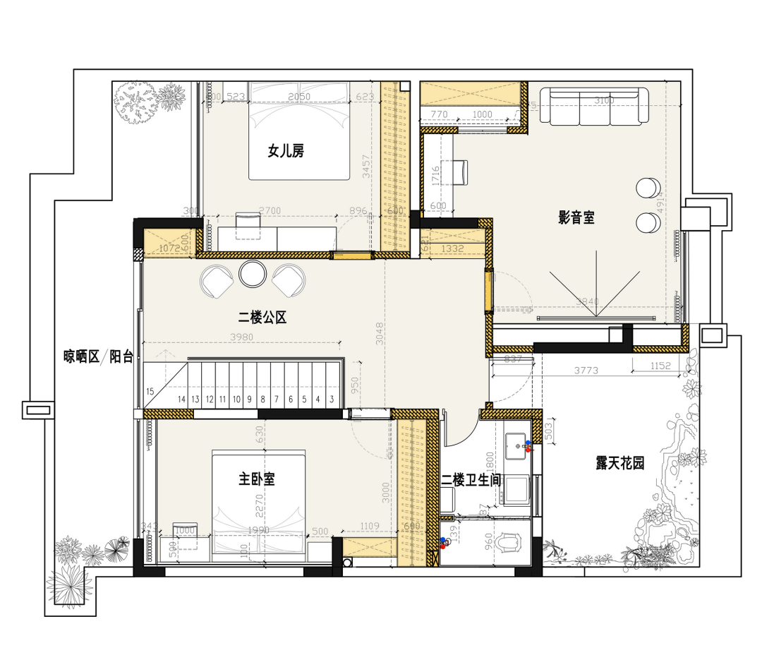 ❶ 原始2楼只有一个卧室和卫生间,搭建后进行公区私区的整体规划。