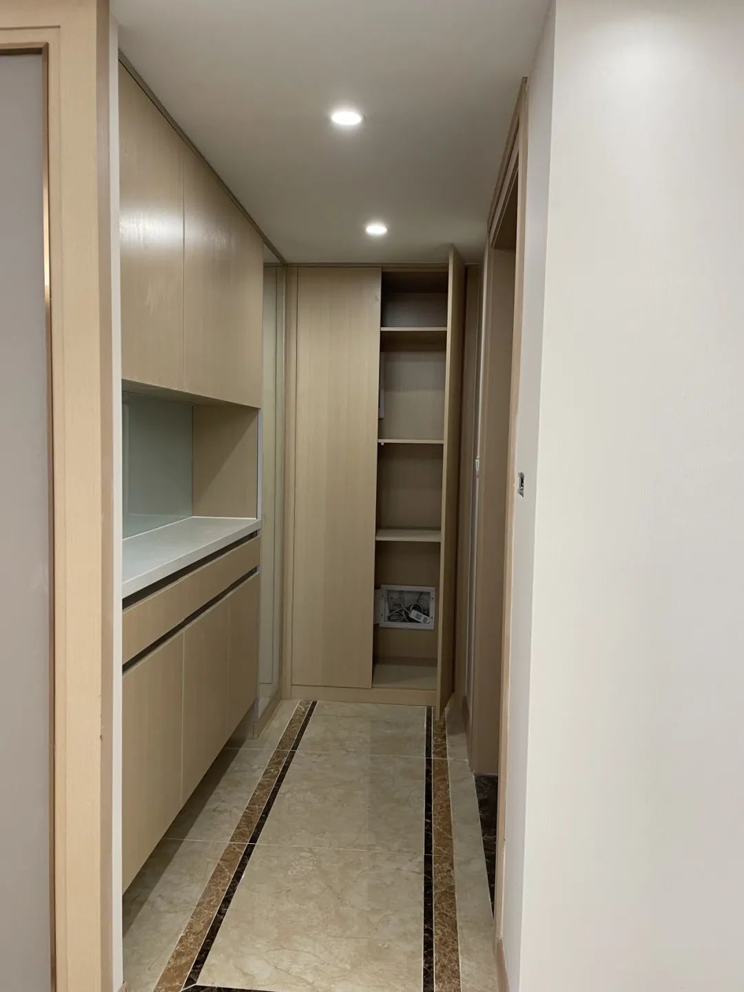 原来进门处的玄关柜体比较狭长,整体视觉比较拥堵,设计师拆除原始的玄关柜体进行重新改造,缩短玄关柜体并做不到顶设计,让整个视觉通透性更强。