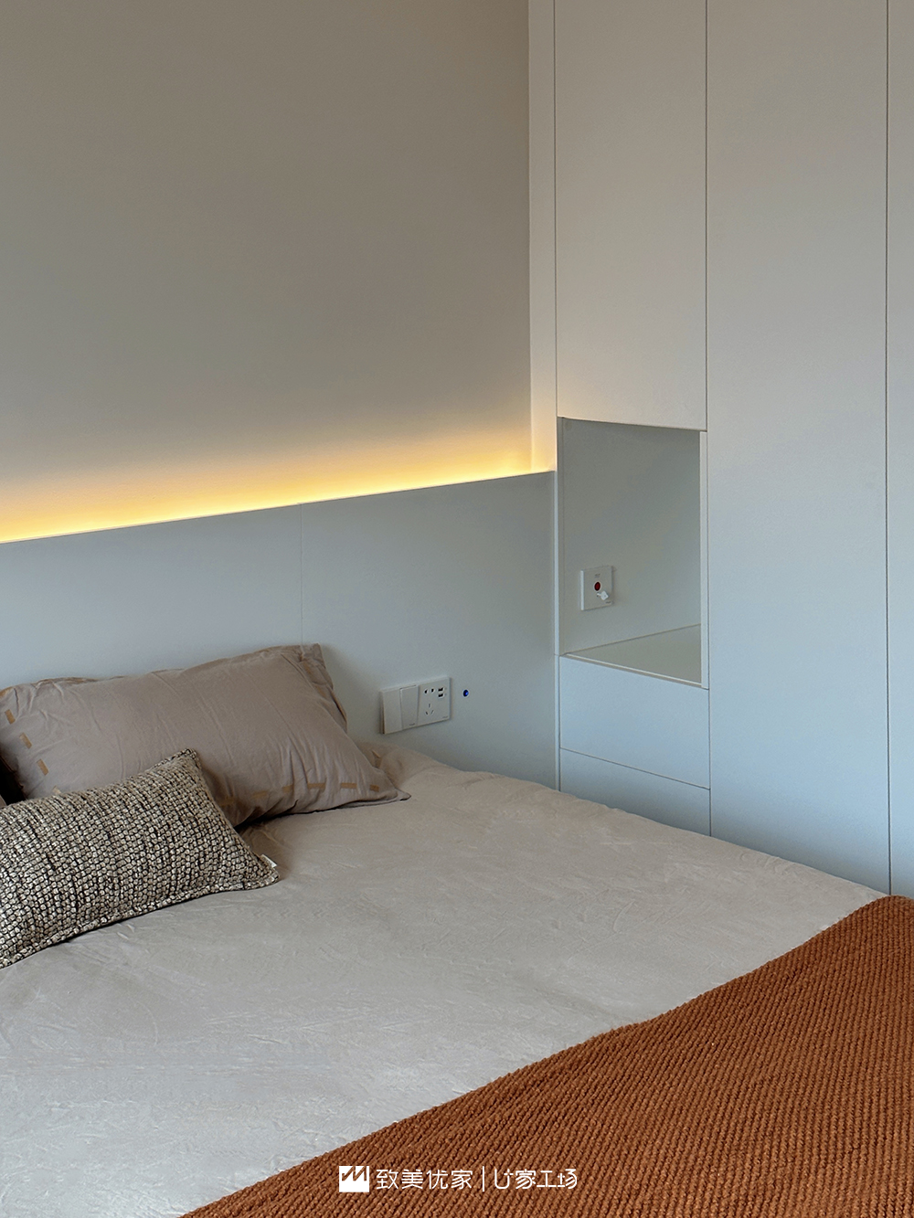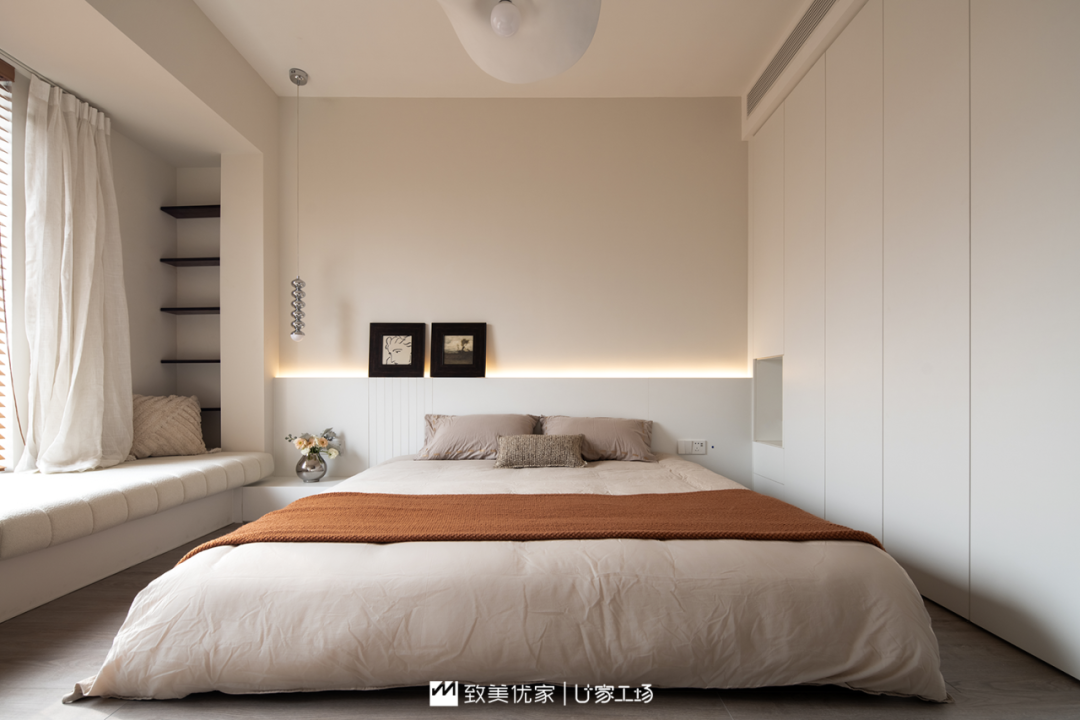床头直接使用背景墙拉通,灯带营造温柔舒适的氛围,地台减少飘窗和床之间的高度差,飘窗定制软包作为卡座,增加温馨感,也进一步放大空间。