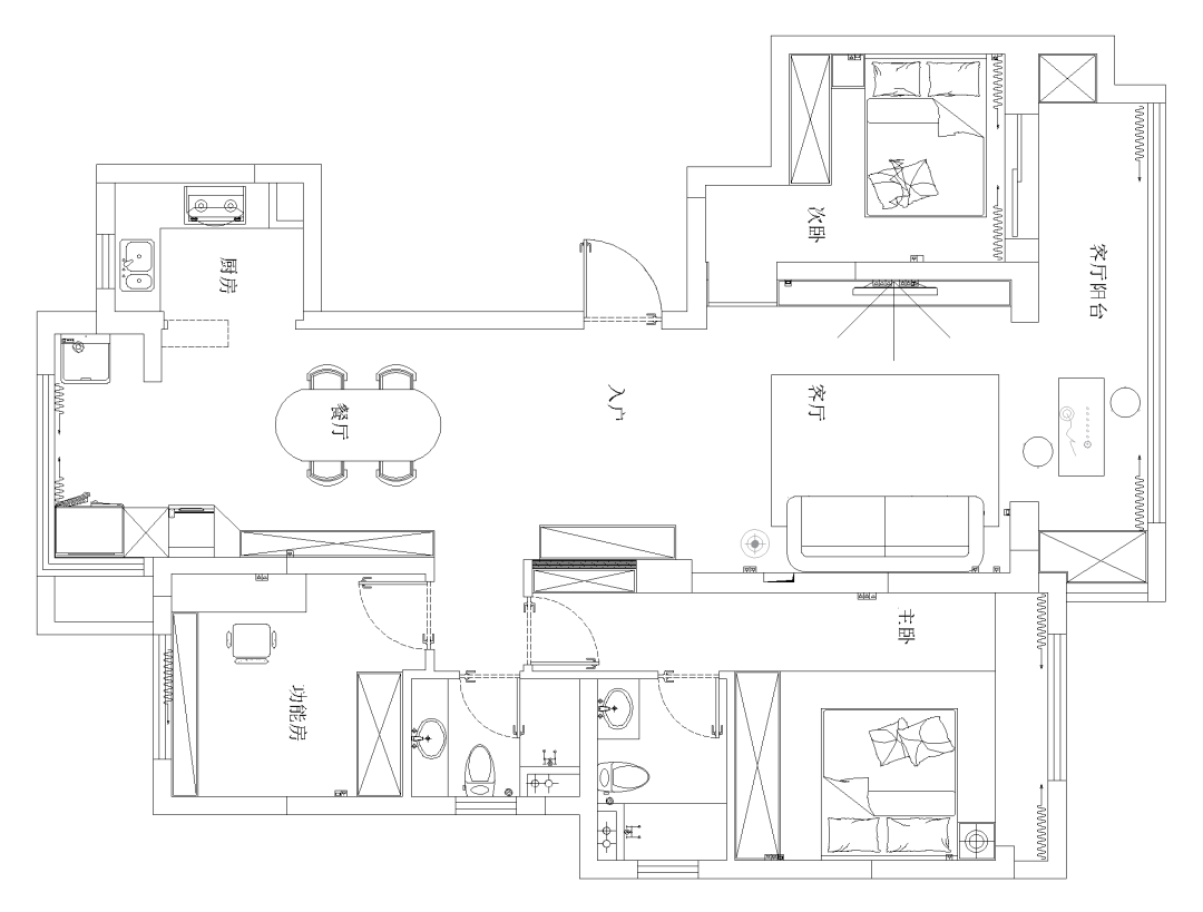 ❸ 次卧改为隐形门,让电视墙更整体,电视与沙发可以居中放置;