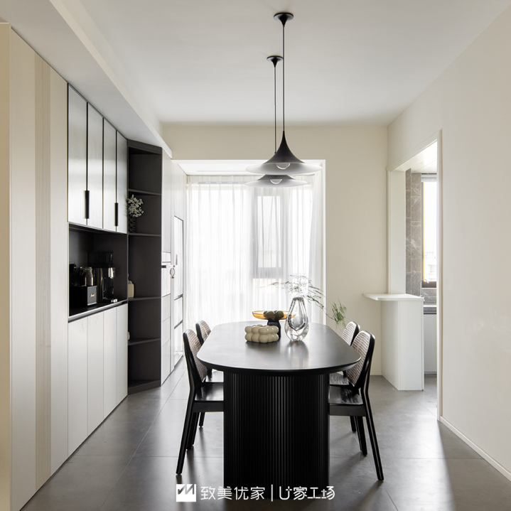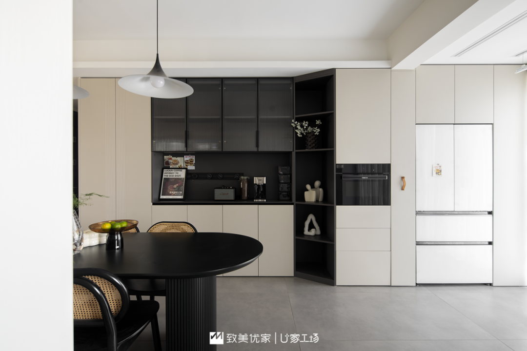 自阳台到餐厅的柜体分文储物、餐边、烹饪三个区域,零嵌冰箱和蒸烤一体机提前量尺,严丝合缝地其纳入。
