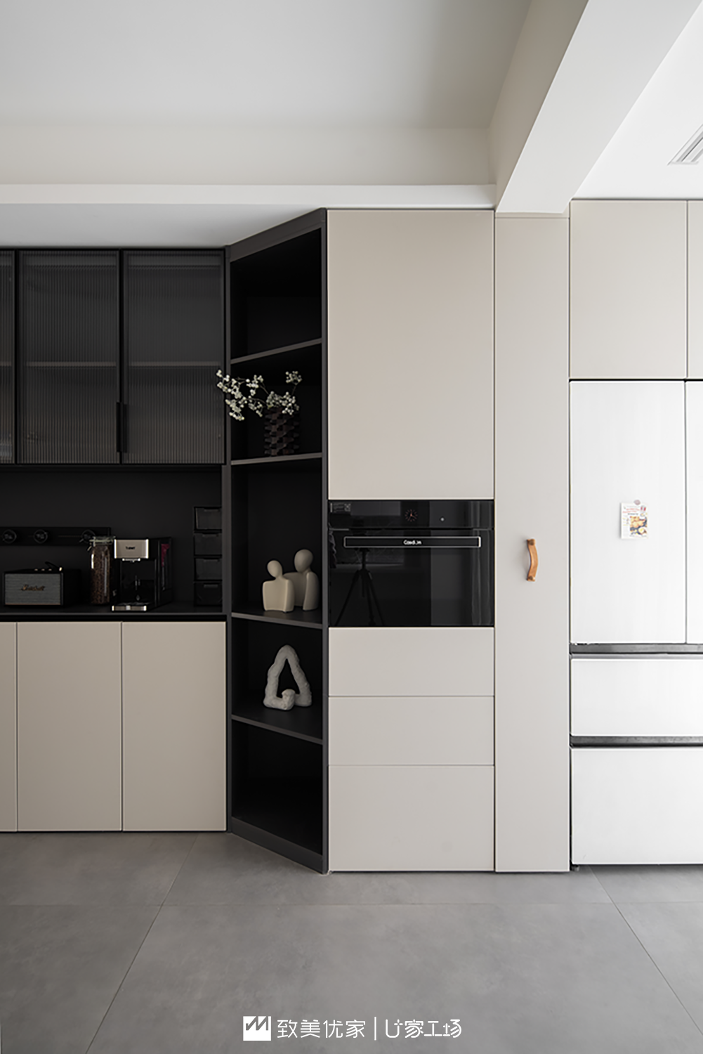 ❹ 生活阳台纳入室内,通过不同深度柜体,照顾到冰箱烤箱放置以及餐边柜与餐厅之间的位置关系;