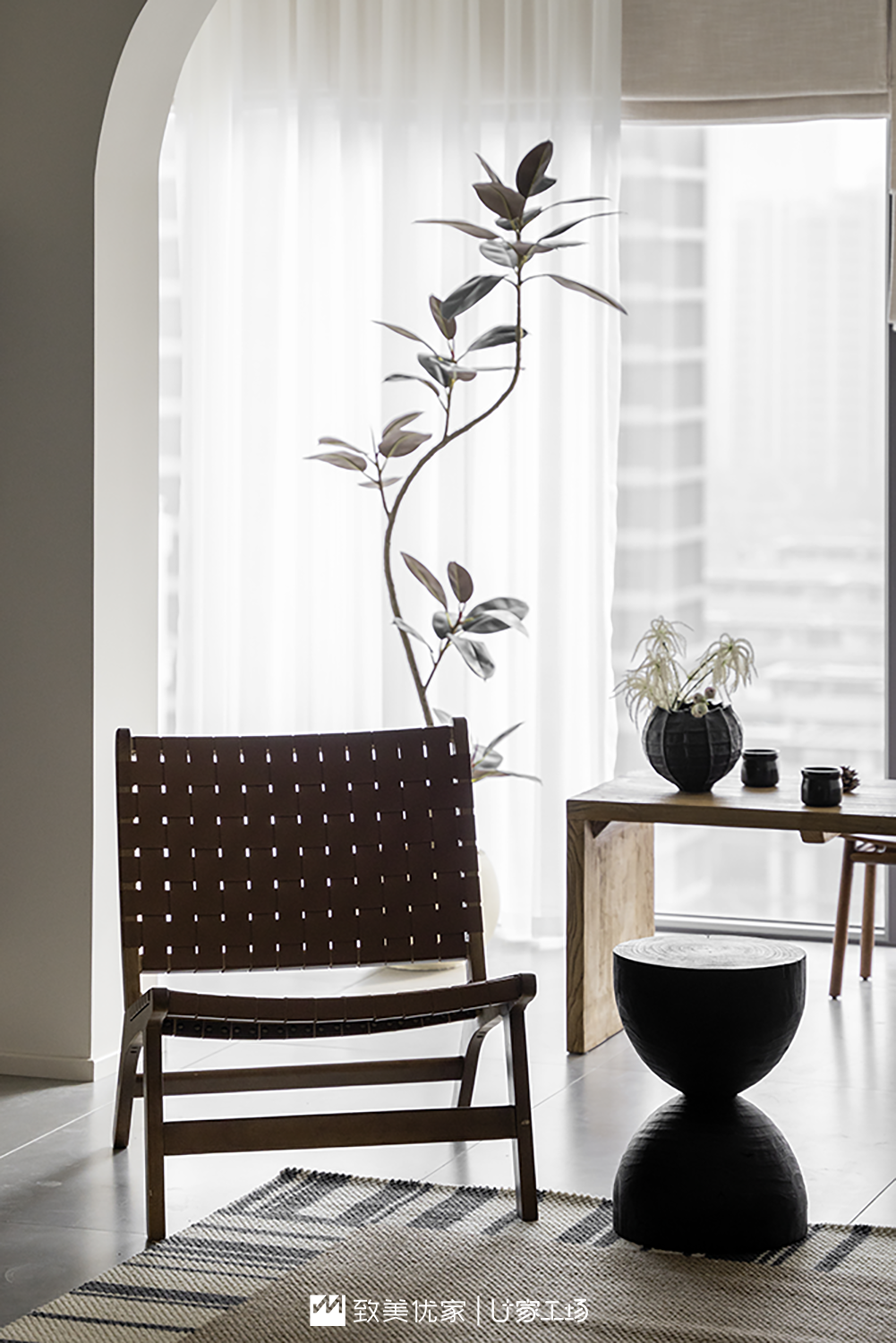 客厅的另一个重点在于与阳台的衔接,单向弧形收口避免了双弧线的过多遮挡,也加入了柔和的过渡。直角收口的一侧则通过无拉手定制柜与墙面找平,增加大量储物空间。