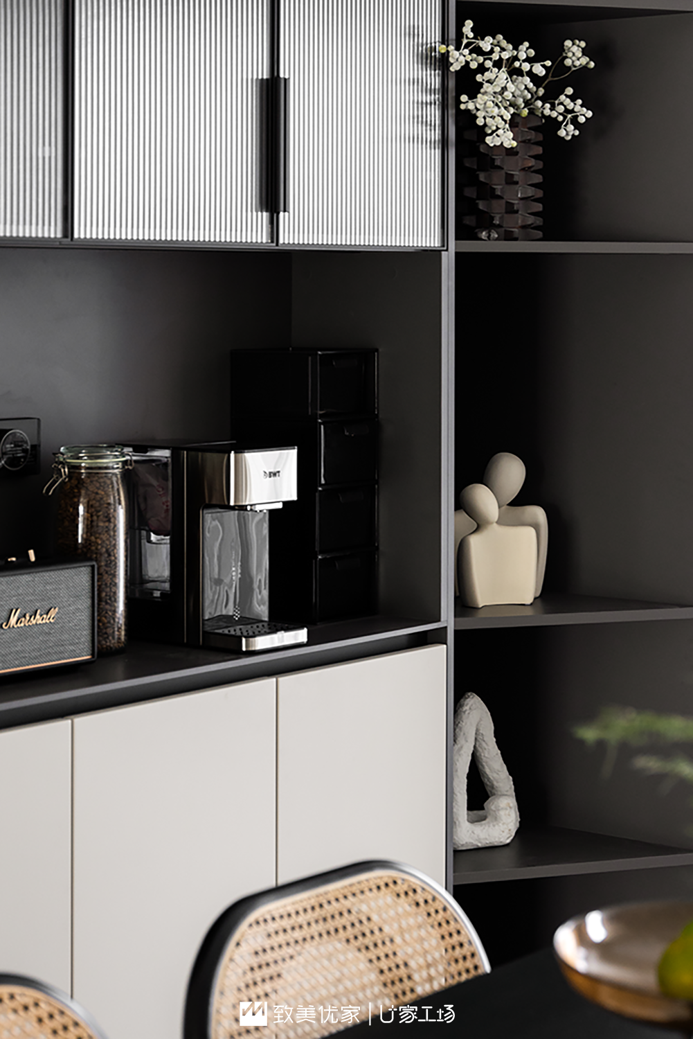 深度差部分,使用黑色开放搁架进行过渡,不仅弱化高度差,还成为了餐厅最具装饰性的空间。