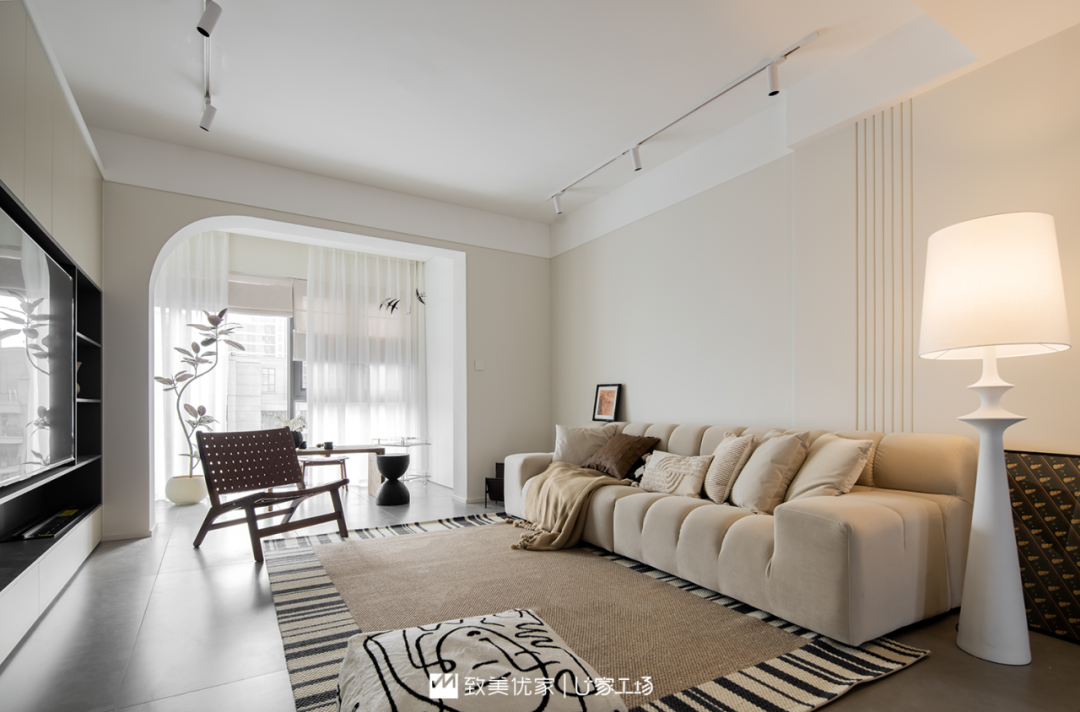 客厅使用无主灯设计,可调节的轨道灯提供精准的照明,电视墙与卧室隐形门联通,形成更完整的视觉体验。沙发背景墙亦通过乳胶漆延续奶油白色配色,使用纵向线条作为装饰,避免大白墙的单调。