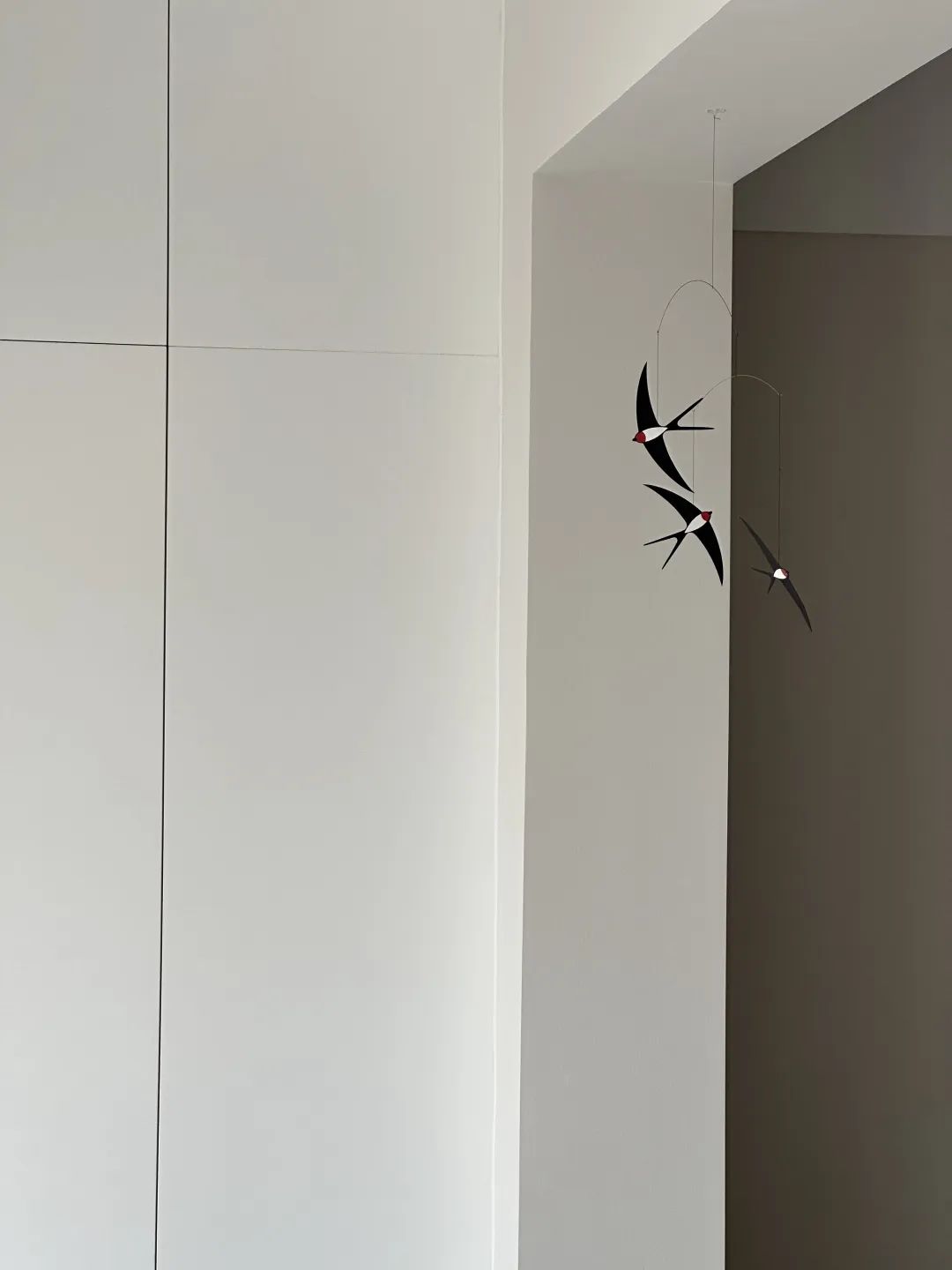 临窗处设置原木茶台和躺椅,打造不可替代的休闲空间,得闲饮茶,坐看云卷云舒,三只燕子悬于身侧,营造出「燕燕于飞,下上其音」的意境。