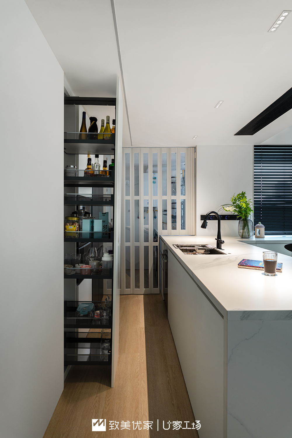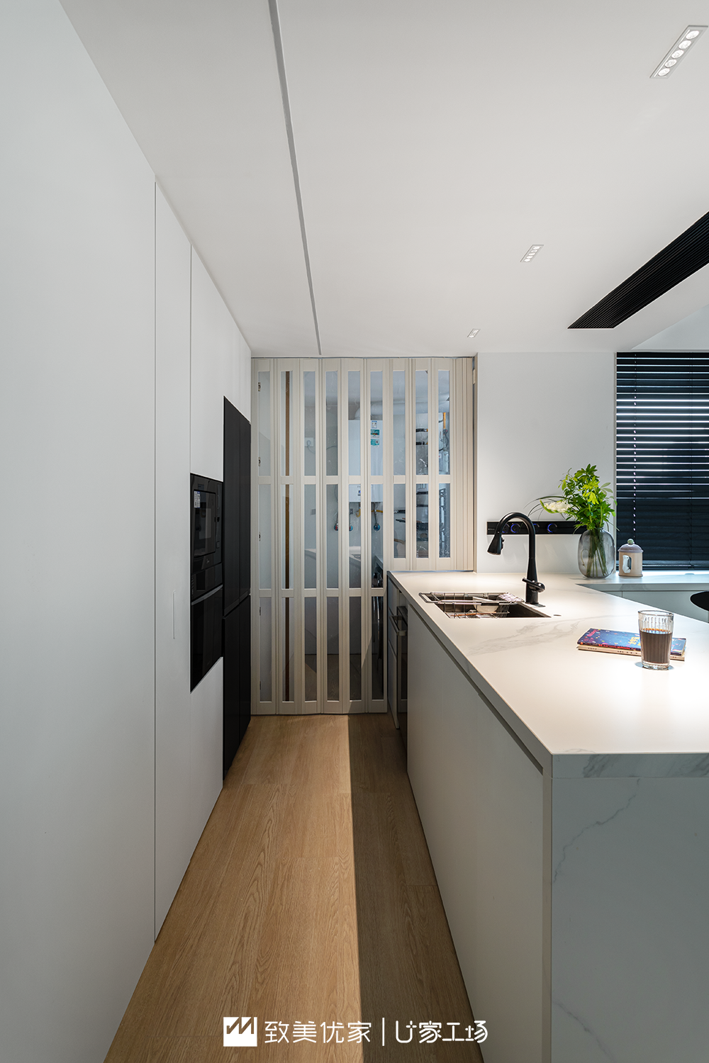 除此之外,为隔绝油烟,设计师还在厨房增加了一面可收缩的门,收起来是开放式厨房,拉起门来是中西厨隔断。