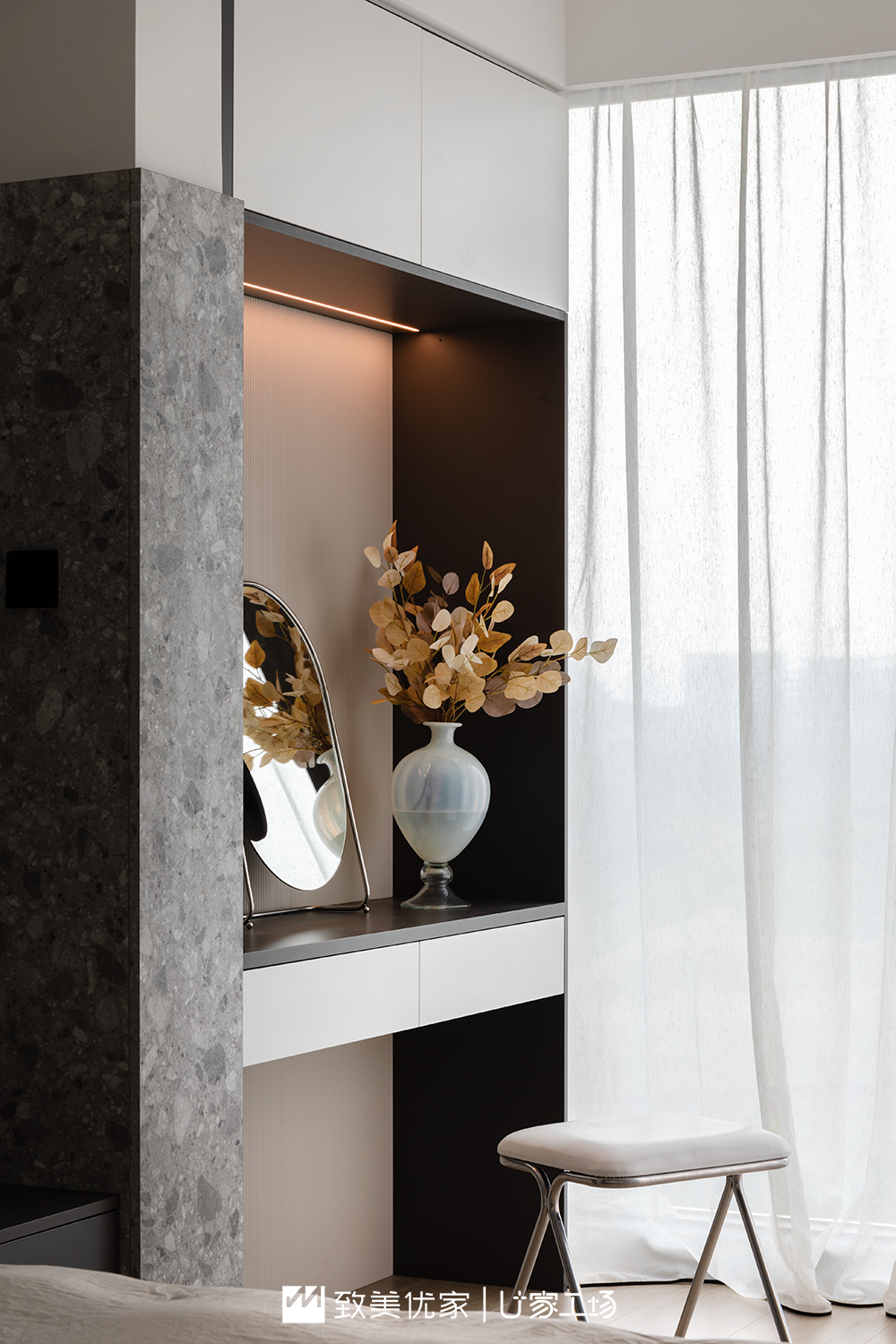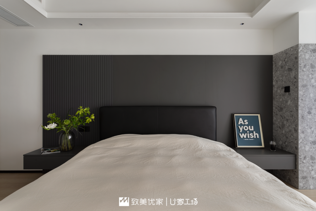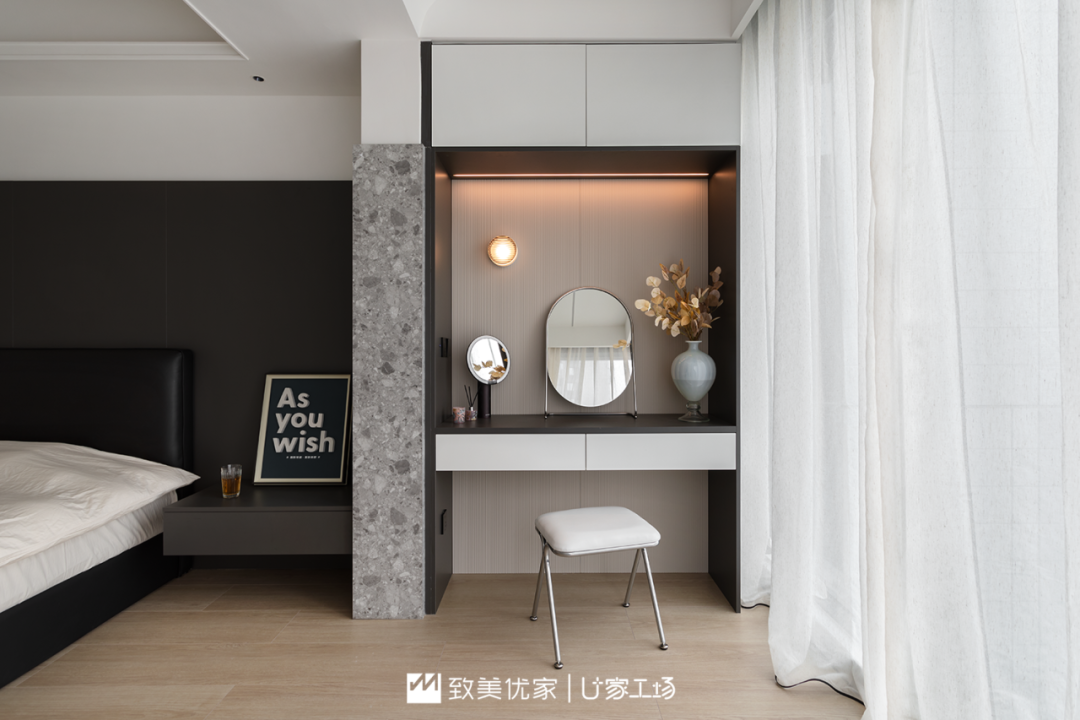 床头与化妆间相接处,用水磨石板材进行了过度,显得极为优雅精致。