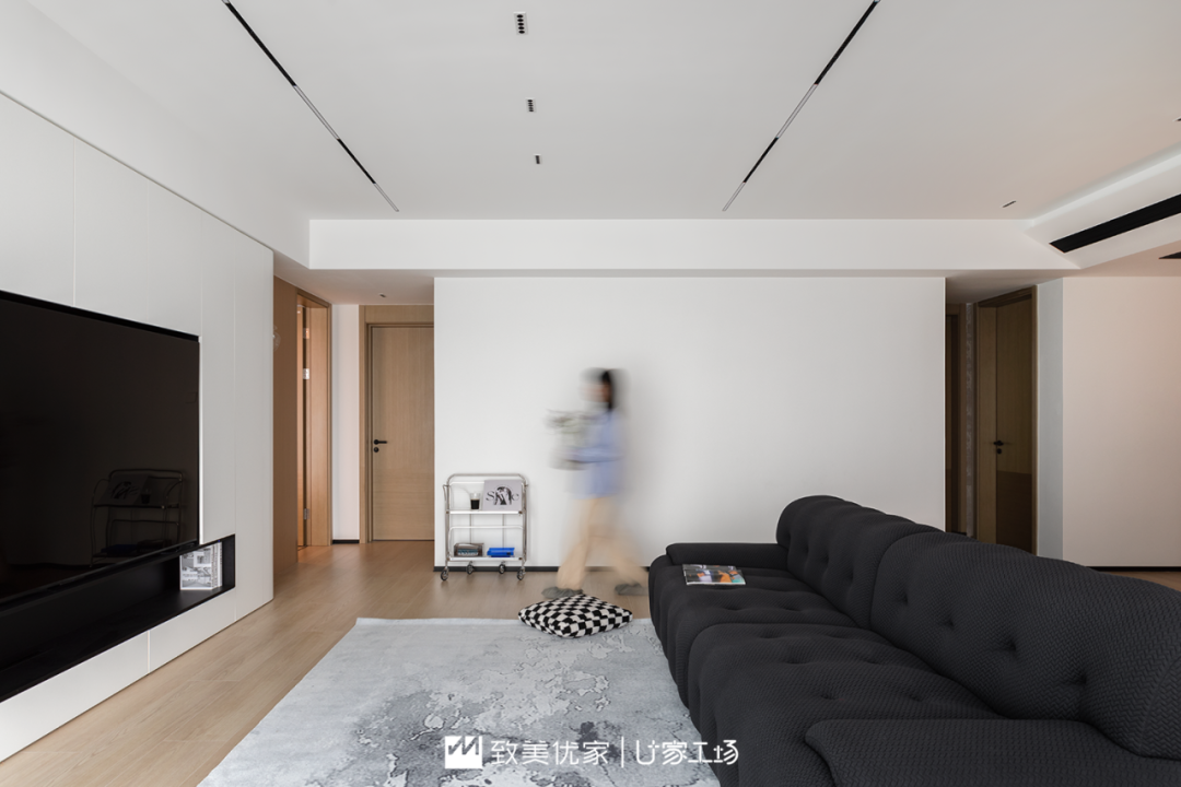 在电视墙的另一端,由于正好是入户正对的视觉焦点,设计师用圆弧形柜体收口,并在木色的墙板上装了一个提升氛围感的壁灯,进门远看,像是一幅巧妙的画景,不仅如此,从主卧出来时,圆弧的造型也会让人觉得这里更加开敞舒适。与黑白电视墙相呼应的是我们2.8米长的黑色沙发,直线条中和着温柔圆润的造型整,让整个黑白灰的客厅空间有了极简的品质感。