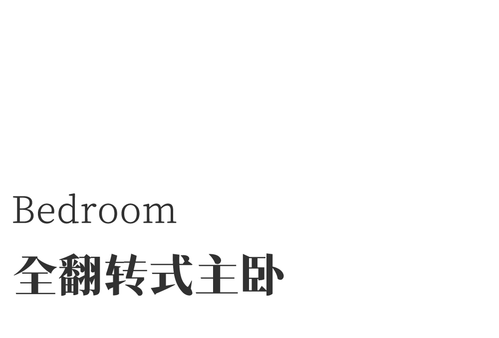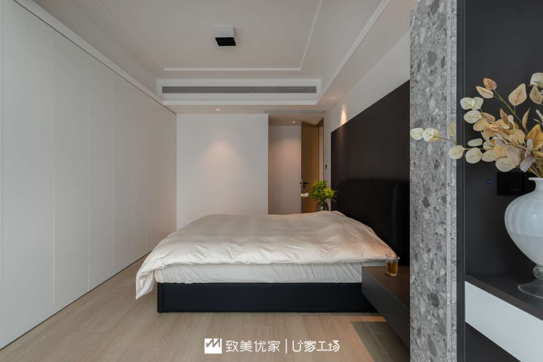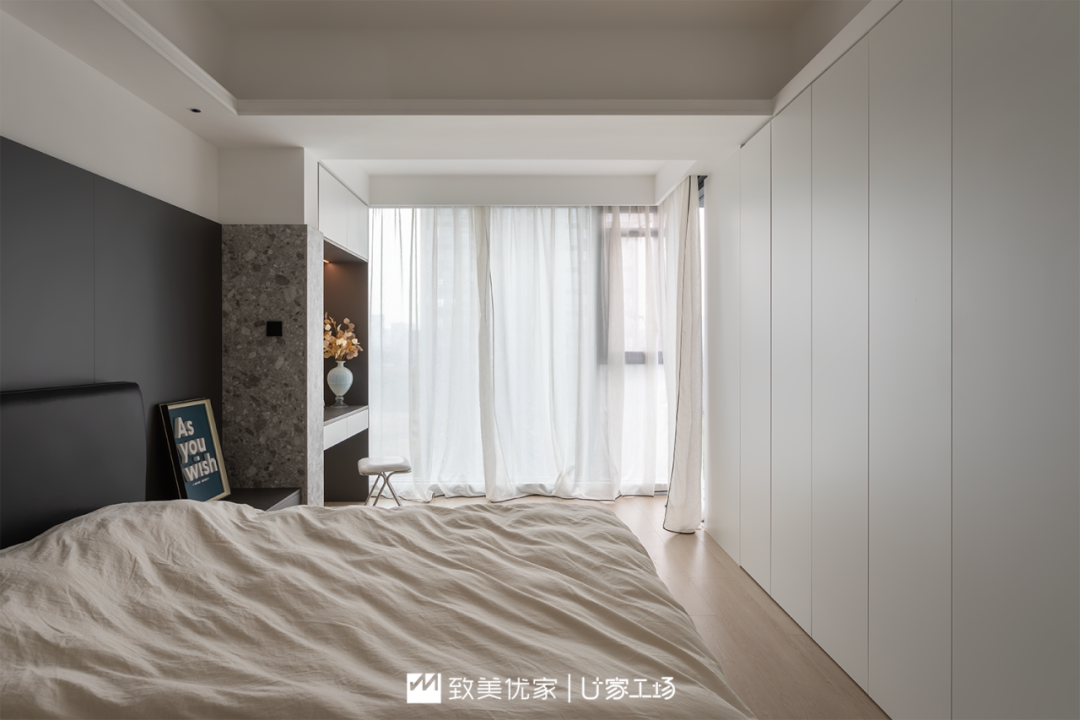 主卧最大的特点是进行了床头床尾全翻转式布局调整,基于床头床尾的调换,整个主卧室的收纳空间和整体性更强。