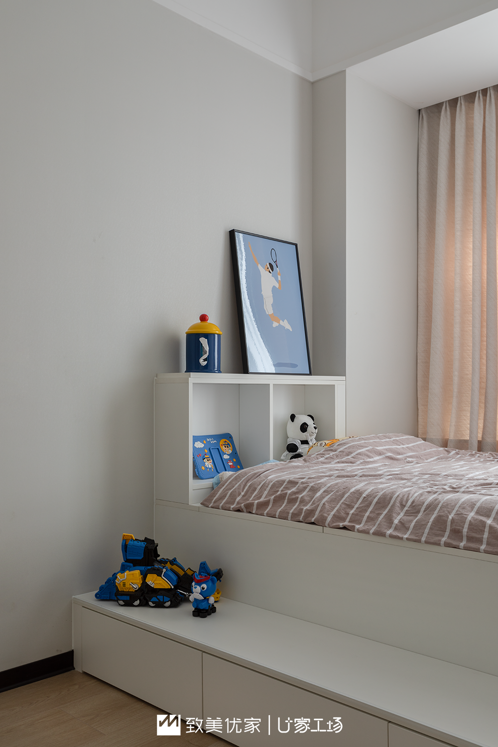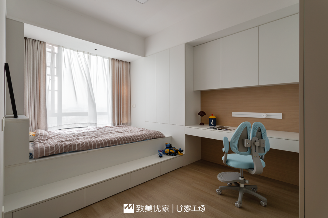 值得一提的是,女孩房是利用飘窗进行了榻榻米搭建,由于飘窗较高,我们在床的旁边进行了台阶设计,方便孩子上下床更安全,下面是抽屉可以收纳过季被褥,一旁是孩子的学习书桌,满足了睡眠收纳学习多场景使用需求。