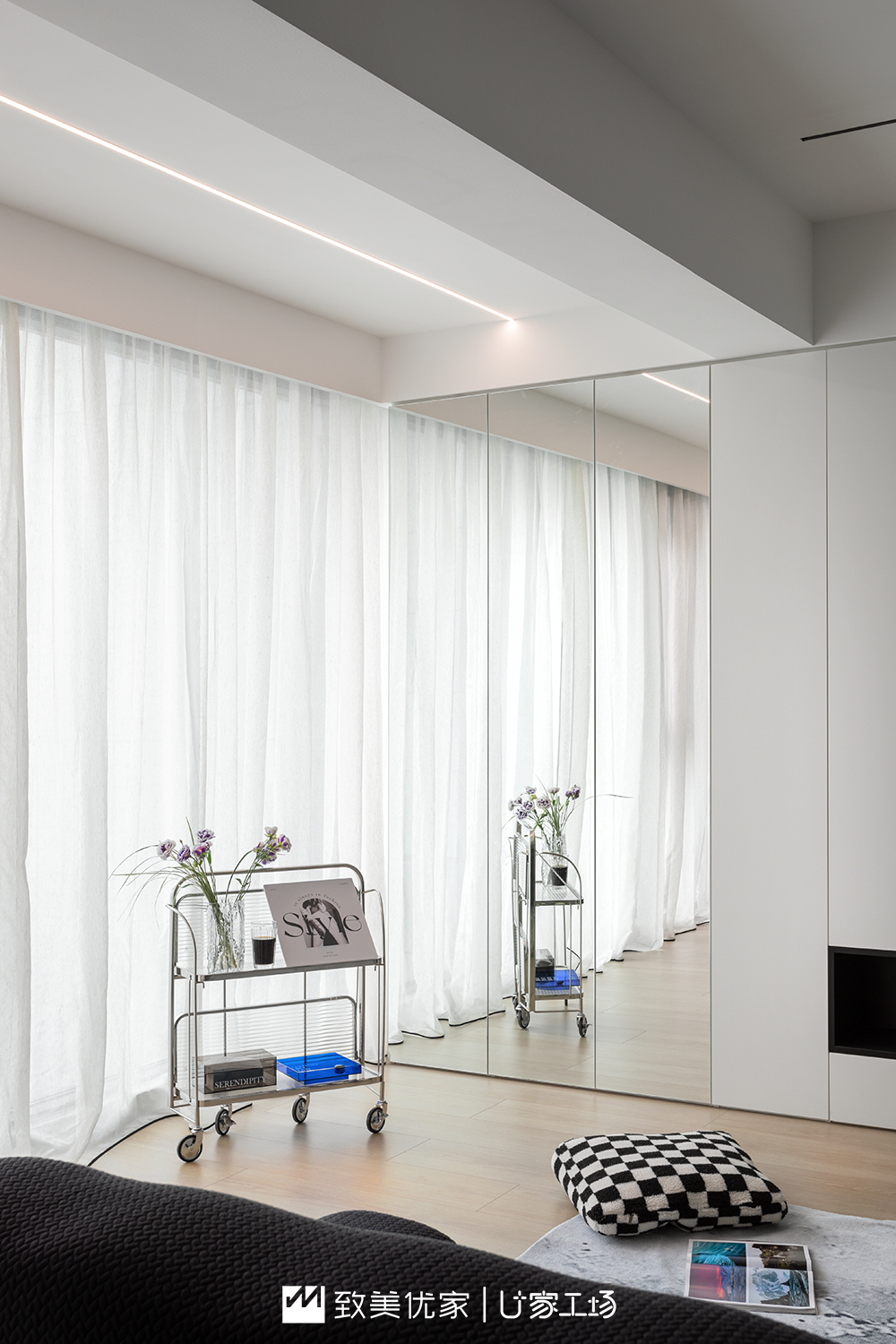 其中,镜柜为整个空间的视觉扩大加分不少。镜柜的加入打破了死板的柜体设计,增加颜值的同时,满足了健身博主的爱好需求,偶尔在镜柜前锻炼身体、拍拍视频,分享自我成长的变化,让生活变为可见的美好。