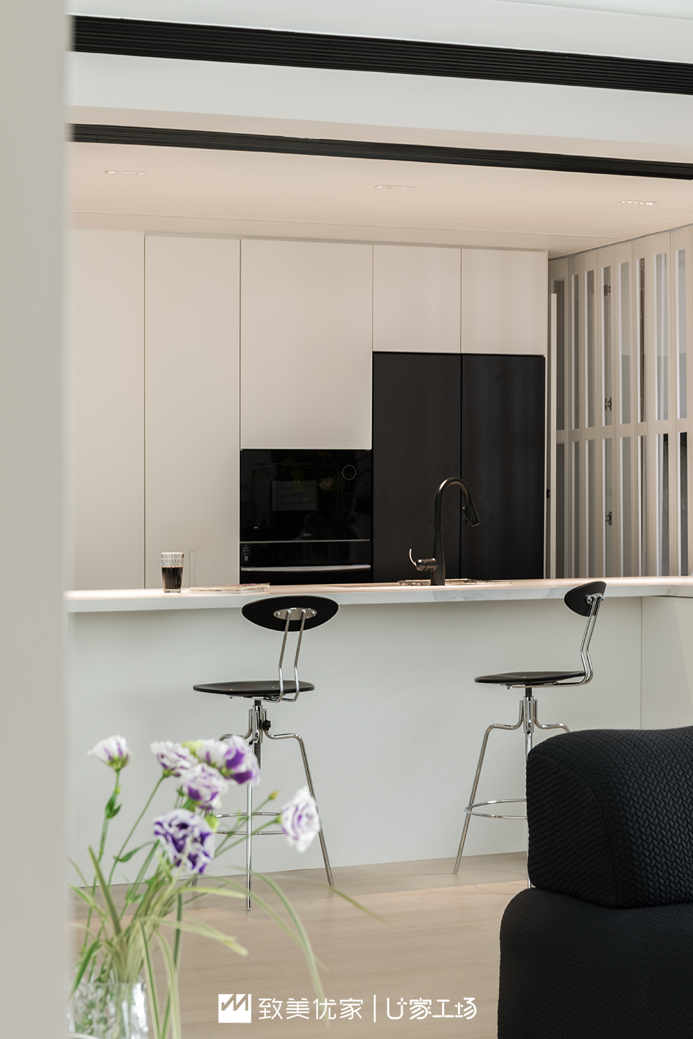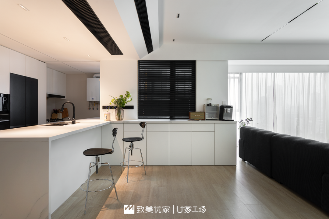 整个餐厨都是黑白配色,浅色为主的空间更加显大,同时黑色的家电和百叶窗点缀,又增加了空间的质感与稳重。