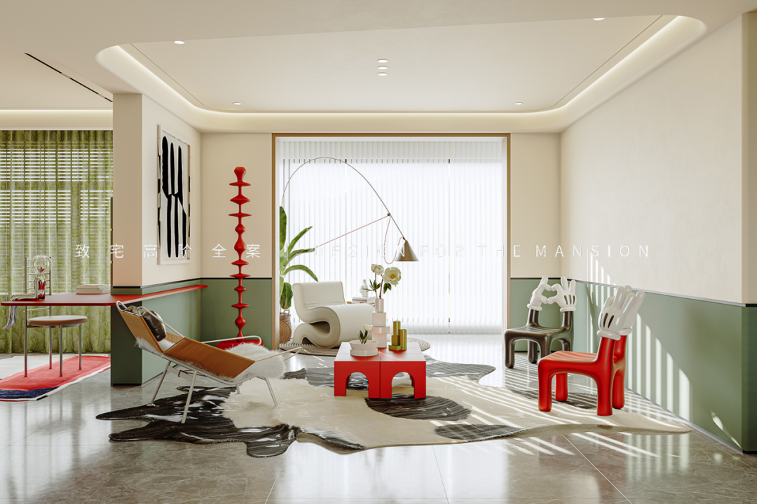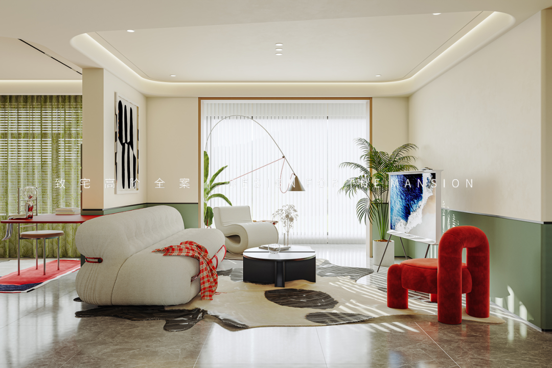 客厅空间没有使用千篇一律的背景墙,而是直接使用绿色墙裙作为背景,配合大钢牙沙发和红色单椅,阳光透过梦幻帘洒进室内,营造轻复古的饱满空间。