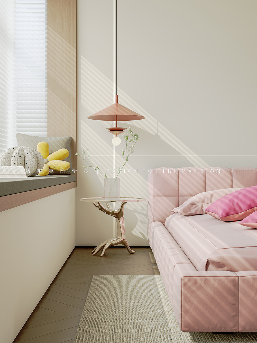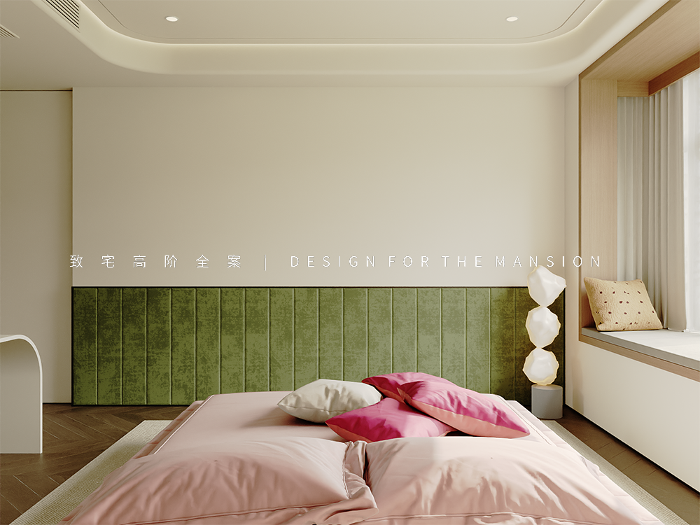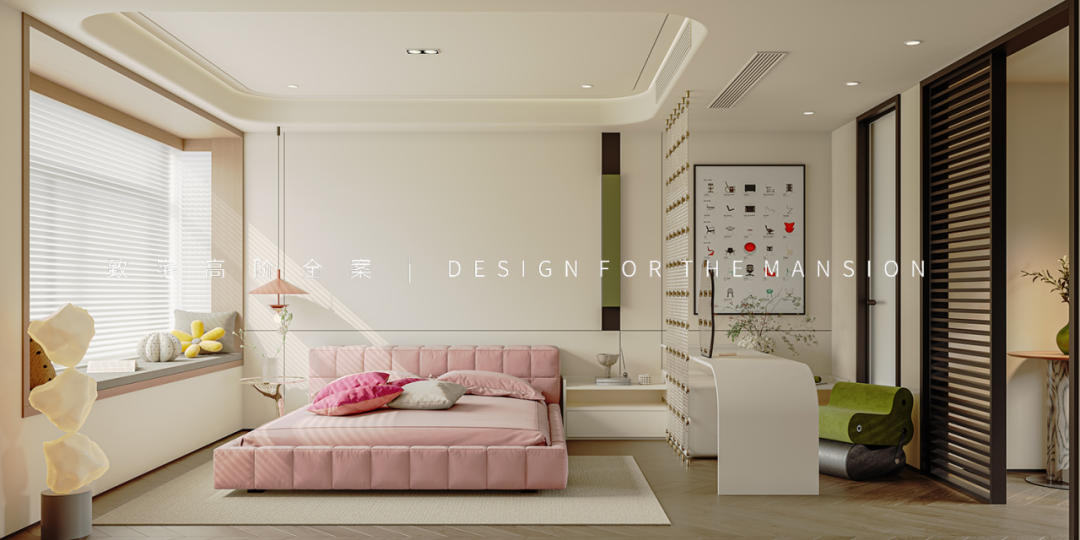主卧的色彩冲击没有客餐厅那样热烈,以樱花粉和牛油果绿为主调,让春日气息永恒地停留在此。