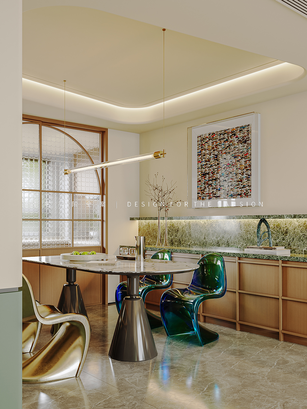 一体成型的镭射餐椅,在古典中混入后现代主义单品,浑然天成,毫不违和。