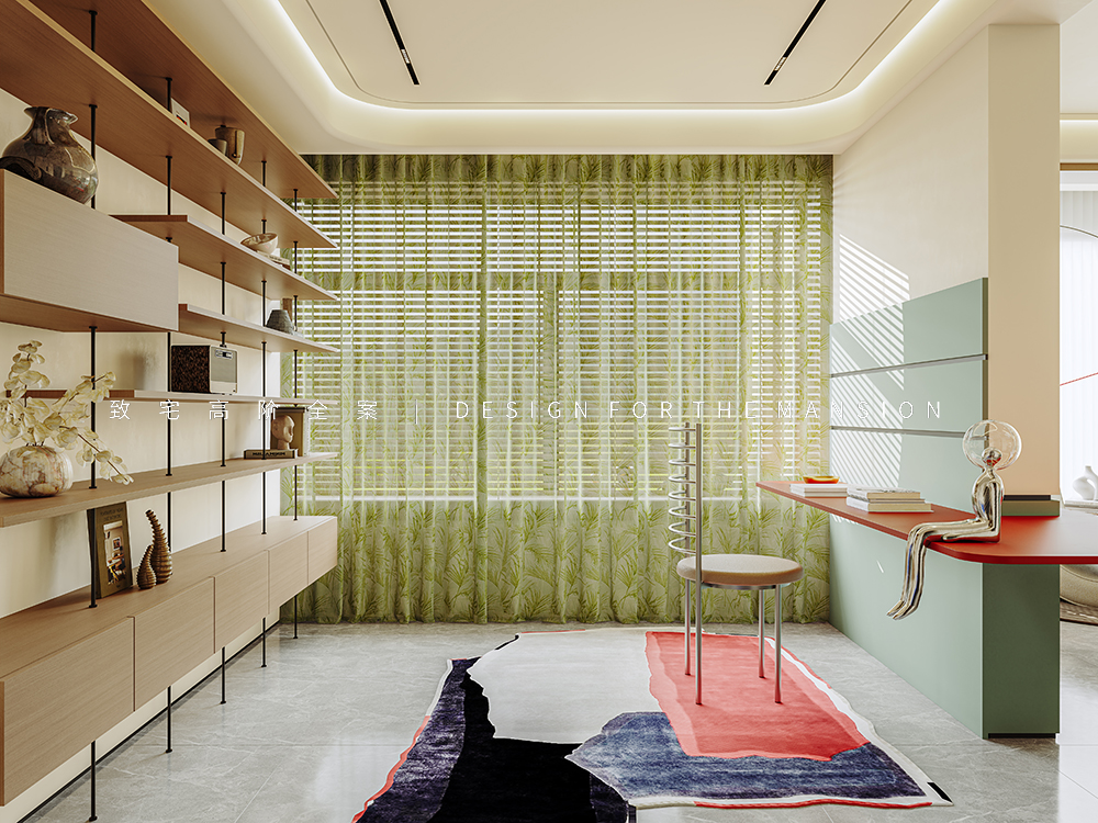 客厅背后,是依托承重墙设置的悬空书桌,将红绿配色进行到底。红色桌面与牛油果绿墙面,形成强烈的视觉冲击力,让人眼前一亮。