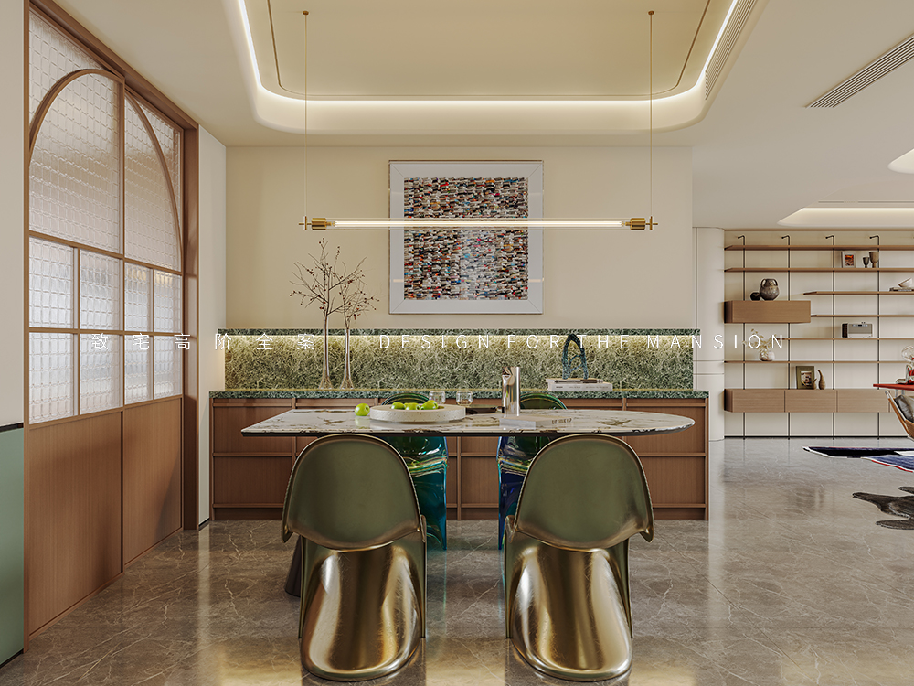 超长的操作台可以轻松解决简易的早餐制作,作为咖啡吧和水吧台也不错。绿色岩板背景墙,结合灯带,照明和氛围感都能得到满足。