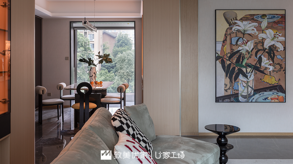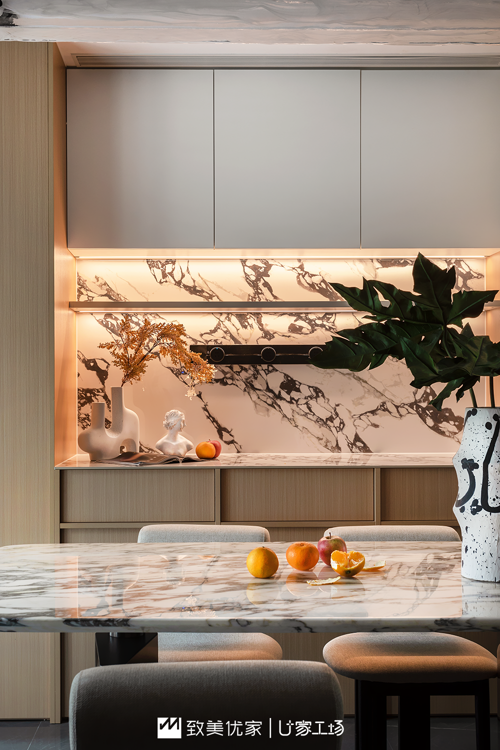 ❸ 餐边柜侧面墙体做弧形设计,减少公区锐利感;