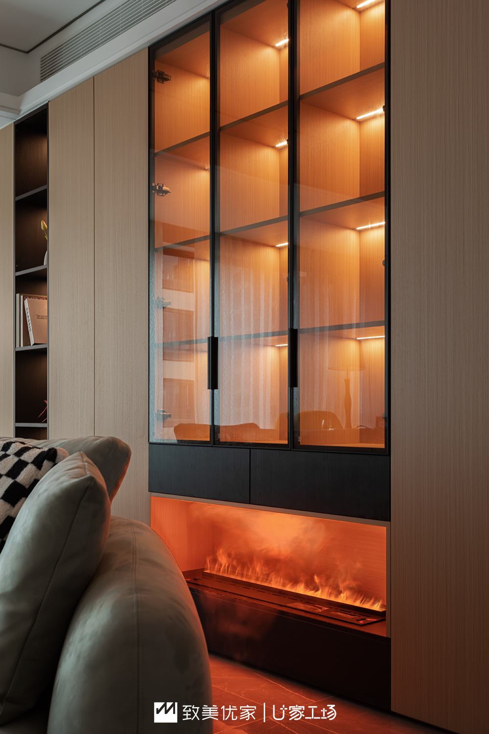 背后一整面收纳柜的打造,既可以隐藏公区杂物,也能展示屋主心爱的藏品,转角带有弧度的设计亦避免了公区过于锋利的视觉感受。玻璃柜体&壁炉的结合设计则为空间增加了更多通透性和艺术美。