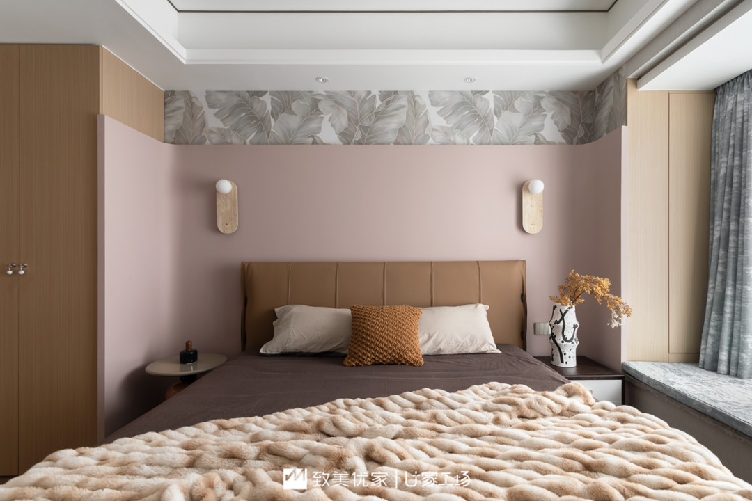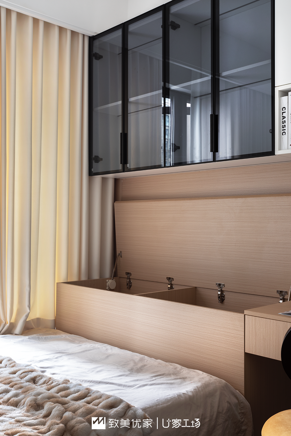 一体化衣柜与床头柜结合的设计方式在满足基本收纳需求的基础上,亦节省了不少空间,让整个房间的布局更为轻盈利落。