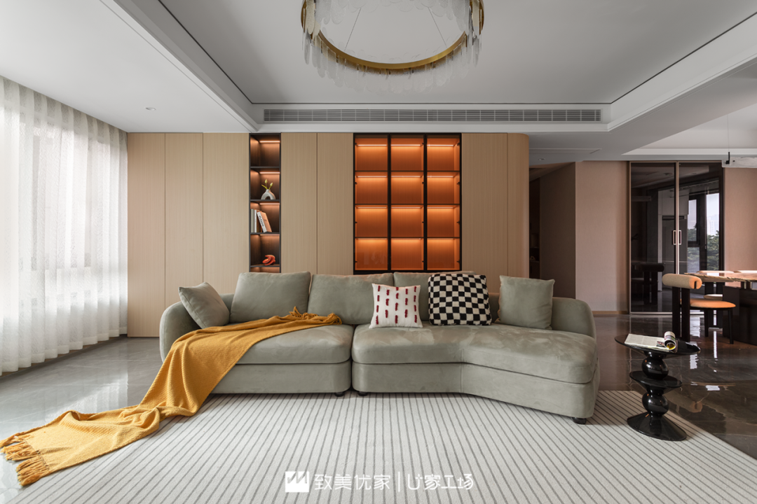 电视背景墙下方还定制了一组悬浮式电视柜,收纳实用的同时便于地面清洁,右侧与白色柜体衔接延续的设计方式也让公区整体视觉统一性更强。弧形沙发对身体具有一定包裹感,在空间中形成围合布局使得日常社交的互动氛围更好。
