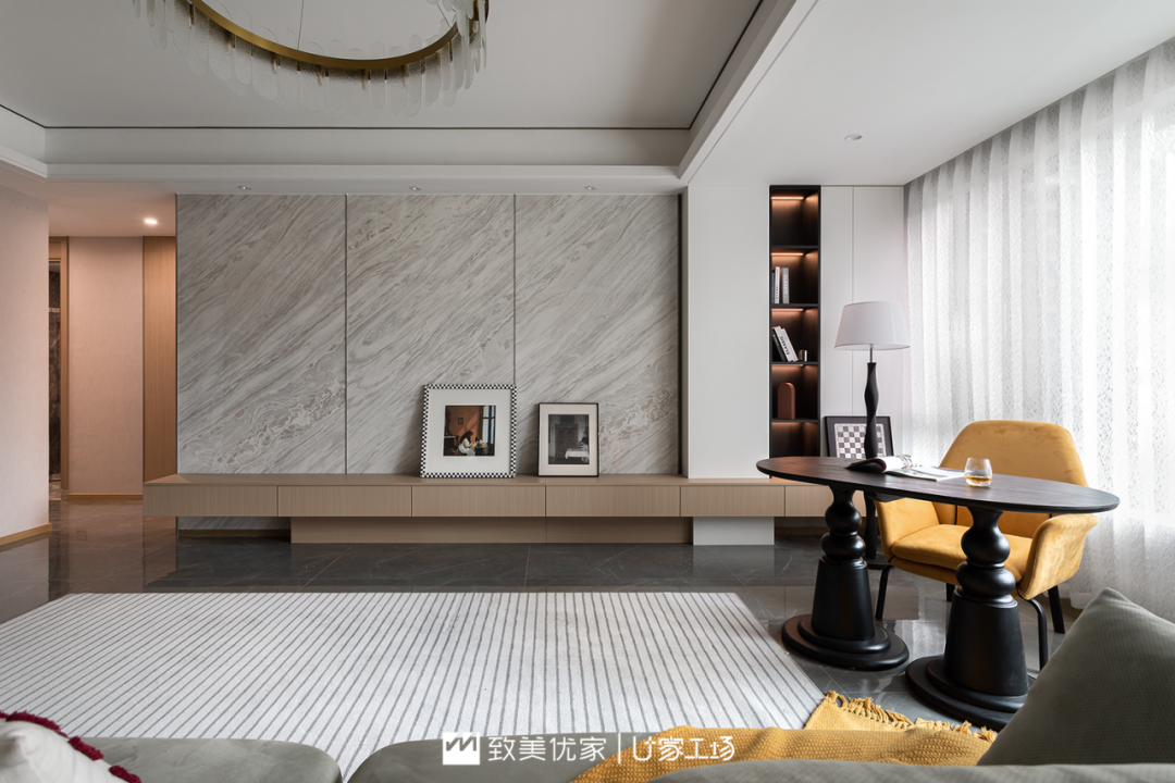 软装上原木色与灰白为主调的色彩语言将空间显现得干净优雅,板材的骨骼线条设计和石材花纹结合令整个平面在视觉上看起来亦充满层次感。