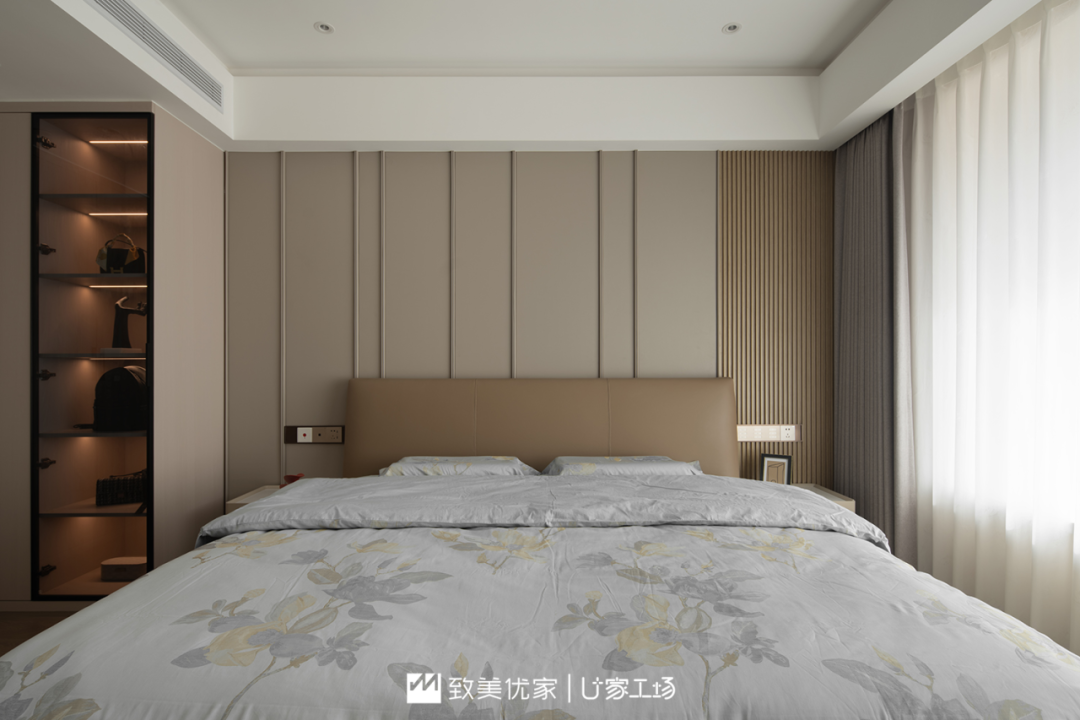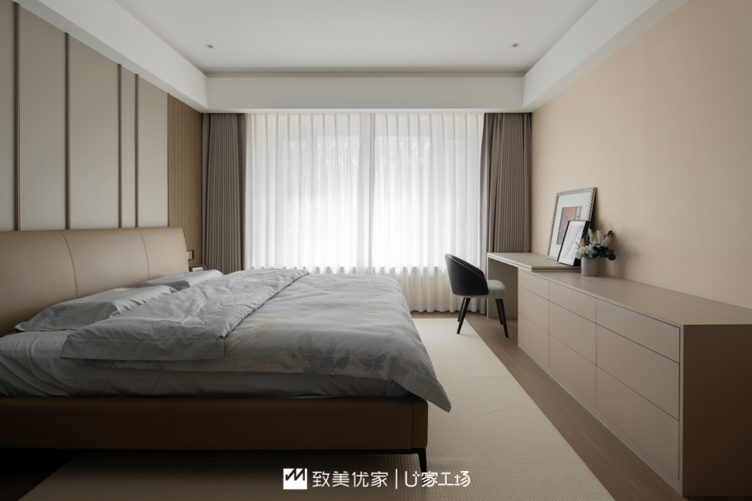 主卧延续了公区的风格,低饱和度的色彩搭配,渲染出了自然舒适的休憩区域,打造出放松心绪的入睡体验,让夫妻二人可以尽情的享受独处时间。