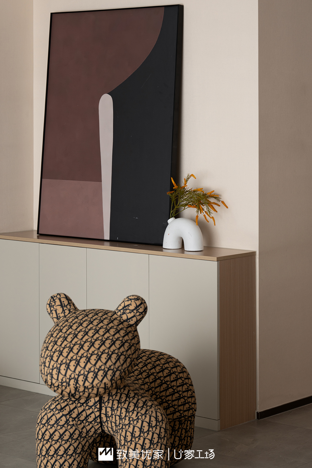 为了满足储物需求,靠近卧室的墙面额外添置了边柜,摆放上颇具艺术感的油画,浪漫优雅的气息从这里蔓延开来。