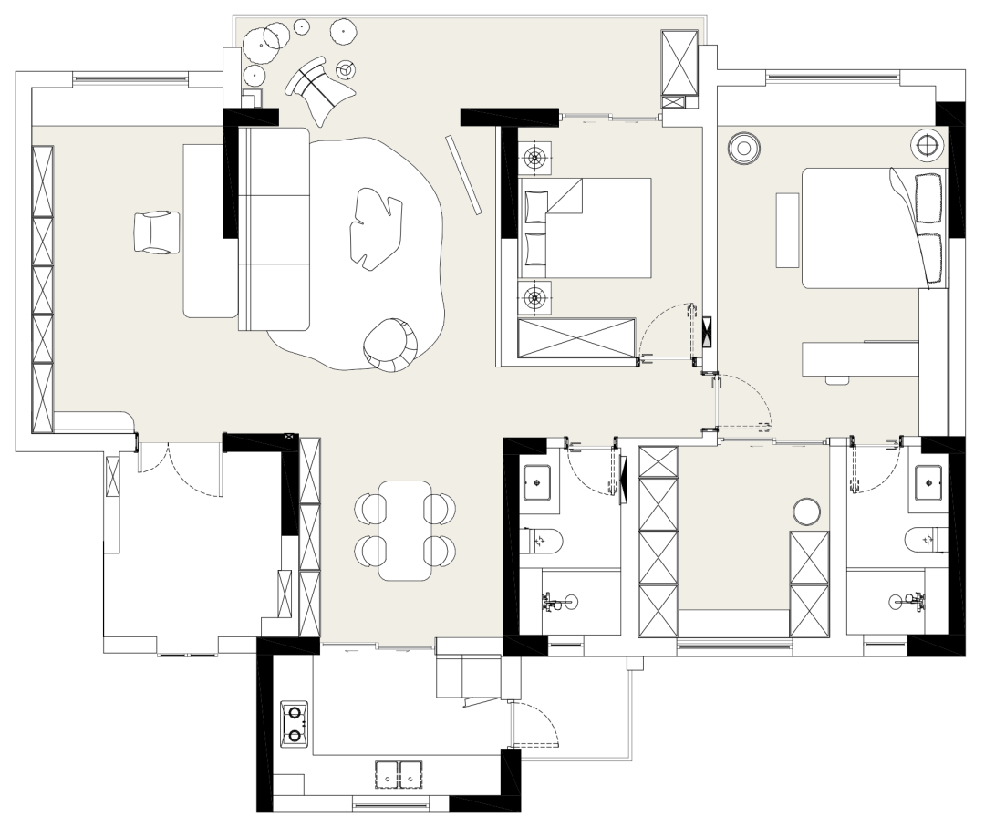 ➌ 打开一间卧室,地板换成和公区一致的瓷砖,延伸空间尺度,竖厅户型改成“方厅”;