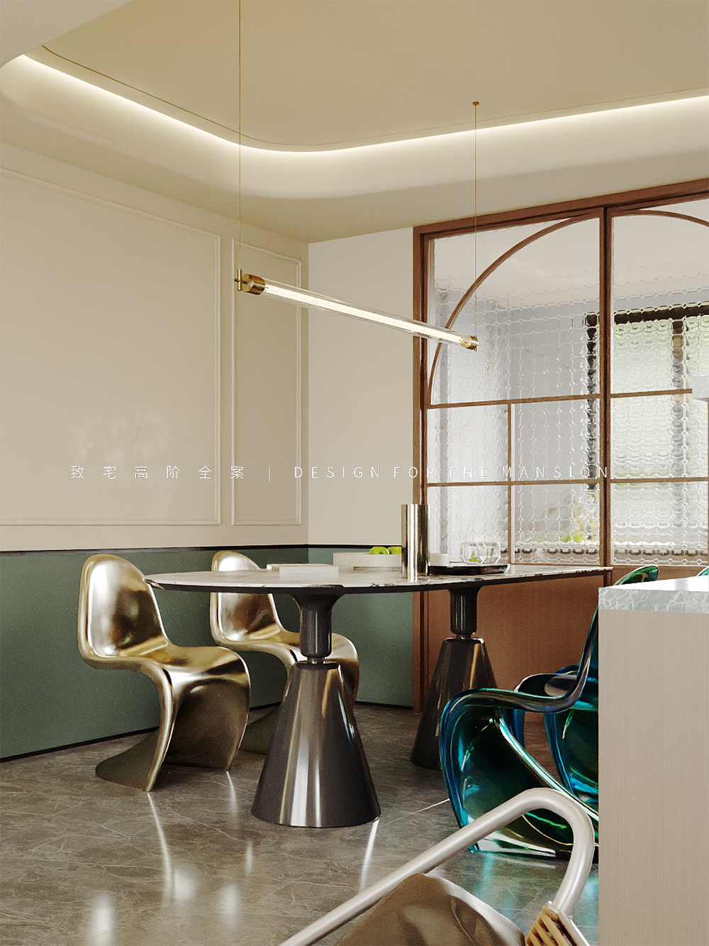 一体成型的镭射餐椅,在古典中混入后现代主义单品,浑然天成,毫不违和。