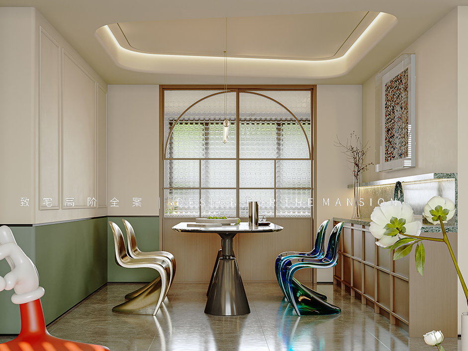 餐厅的复古感较客厅更甚,绿色墙裙延伸至此,更多木质元素加入其中。原始推拉门也替换成木饰面艺术玻璃门,透光不透景,门本身也成为了一处风景。