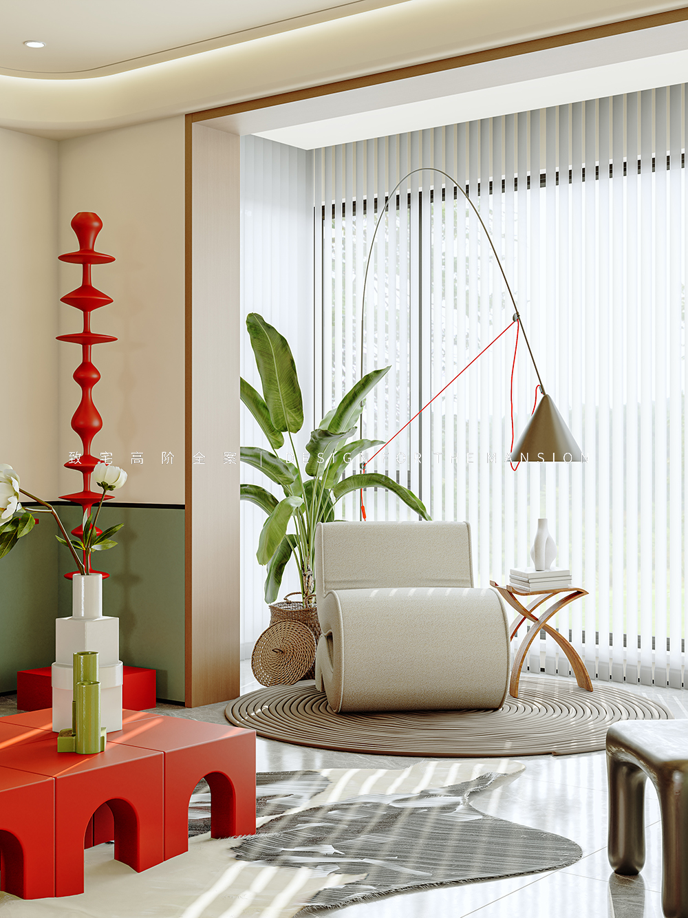 同时我们也尝试将「去客厅化」进行到底,采用全单椅搭配红色茶几和红色饰品,更自由随性,可根据对话场景任意变化,特别适合创意讨论与深度对话。
