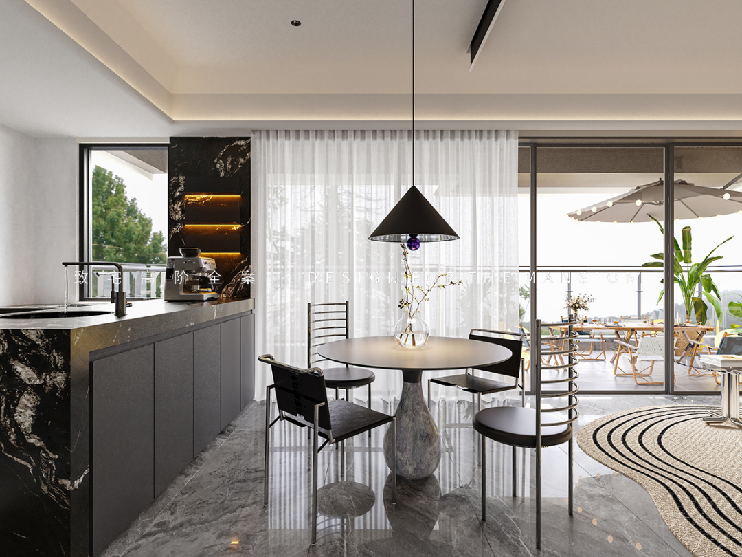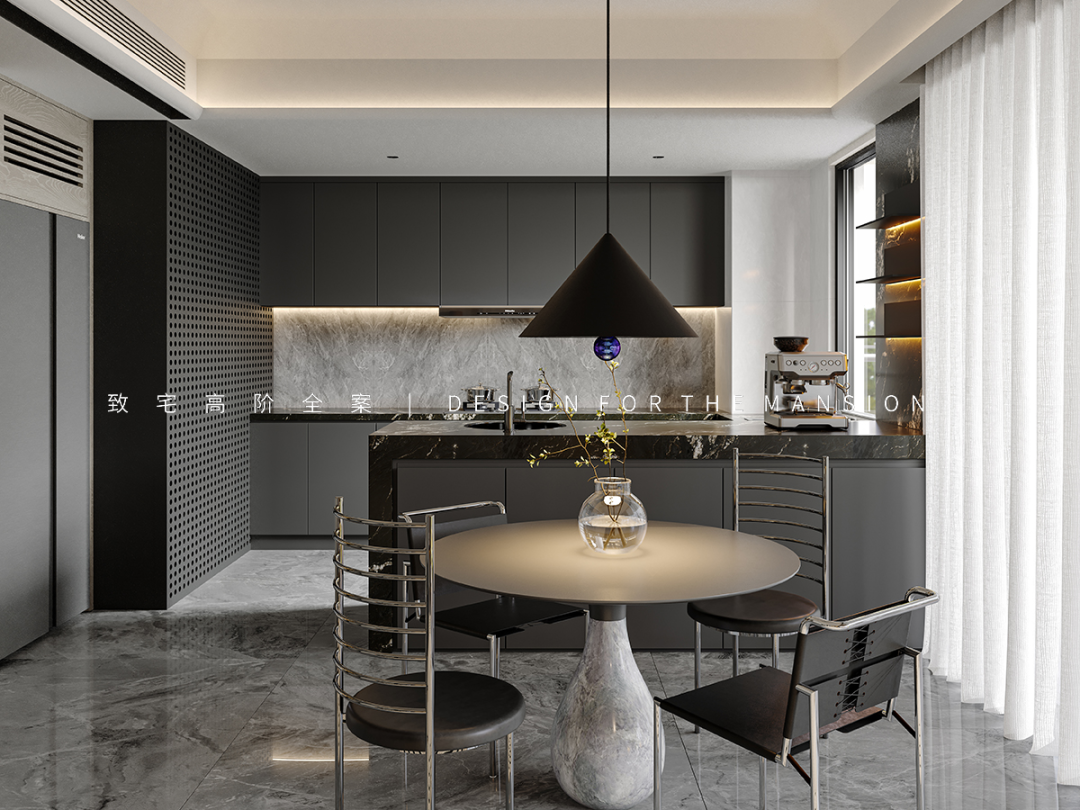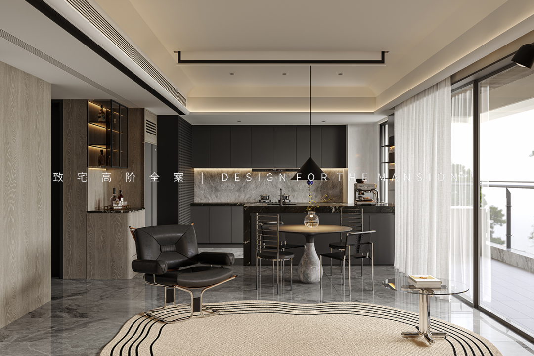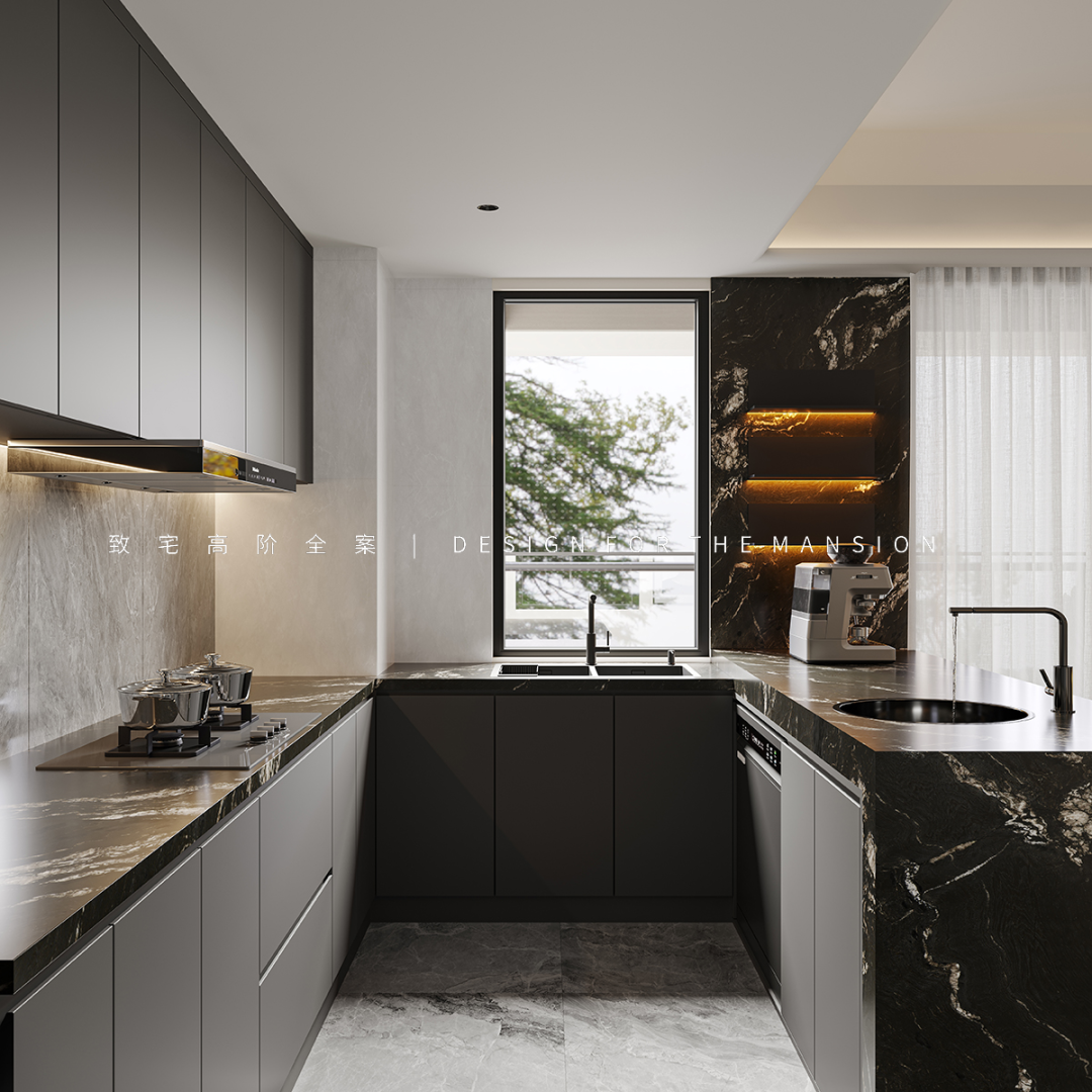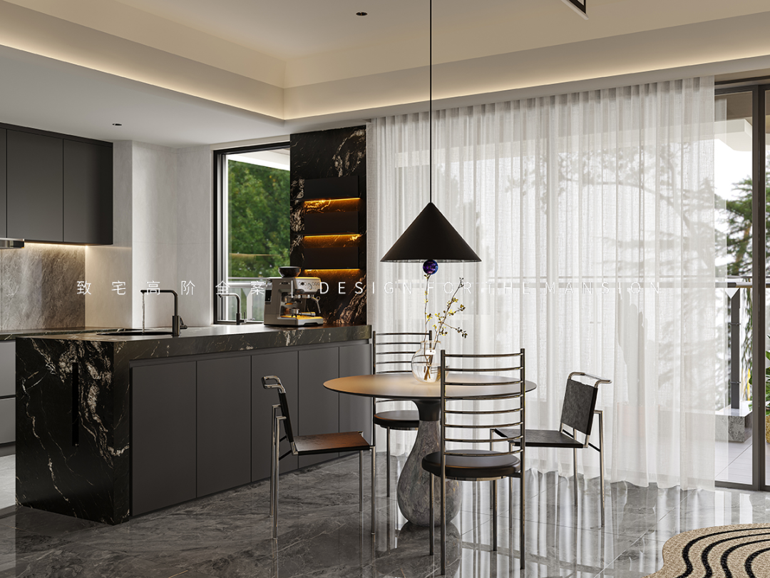 同色系奢石贯穿岛台和阳台与客厅相连的墙体,相互呼应,配合纯色柜体和灯带,氛围感和高级感油然而生。