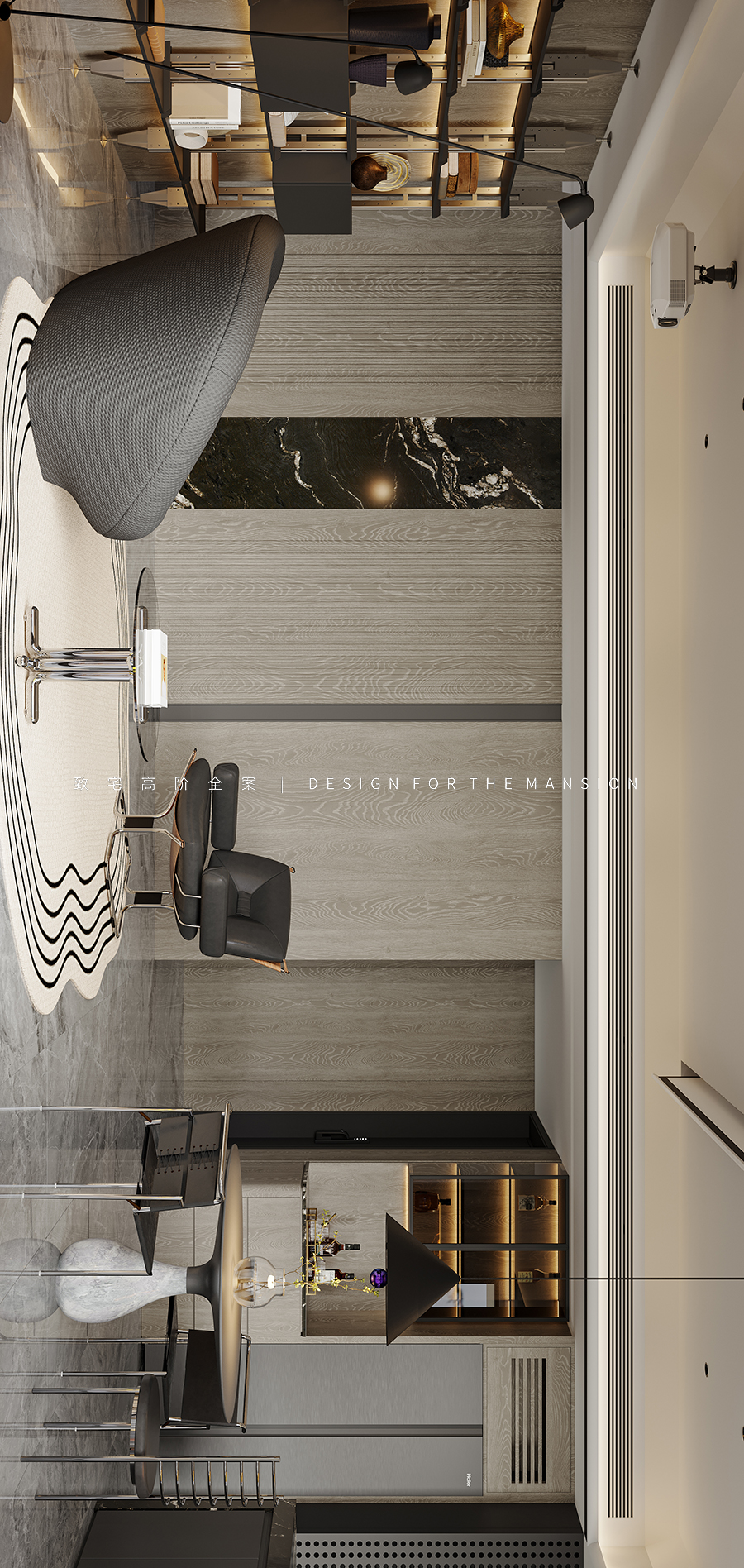 为了空间的完整性和美观度,设计的细节必须到位,客厅过道的墙体使用同色墙板装饰,其中隐藏了一扇卧室门和一扇内嵌柜体门,与餐厅同款石材进行点缀。