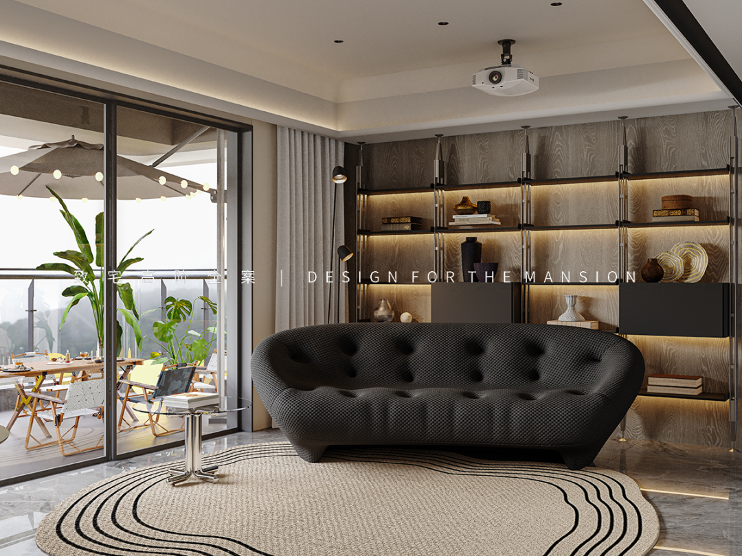 沙发靠背景墙放置,实现拿取图书/观影/葛优瘫都多种需求,把原本横厅的交通空间和活动空间都集中起来,无需设置茶几,空间更显大。