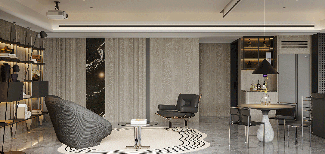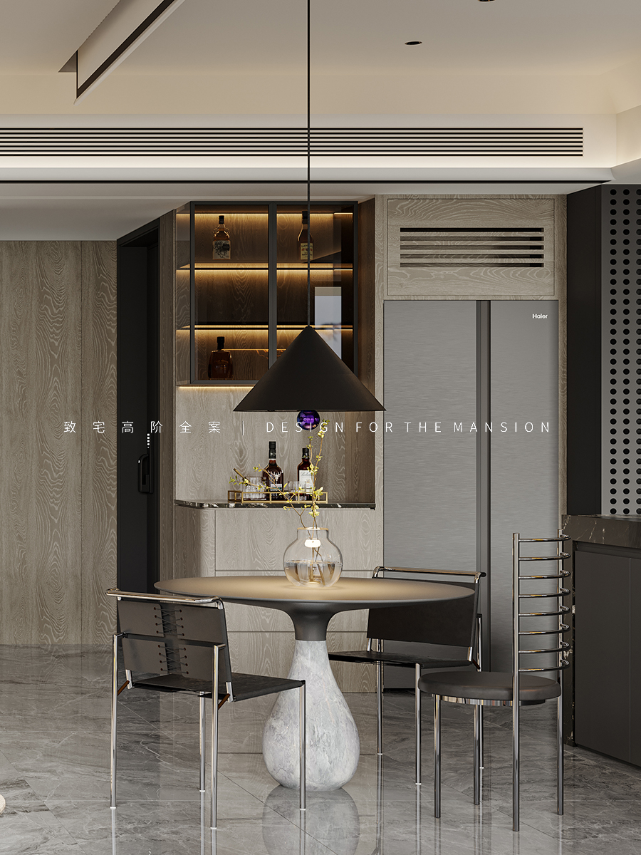 原始预留的餐边空间用以放置零嵌冰箱,并延续墙体的木色墙板做圆角小边柜,同时具备展示和调酒功能,弧形边角对动线友好,行走无磕碰,视觉更开敞。