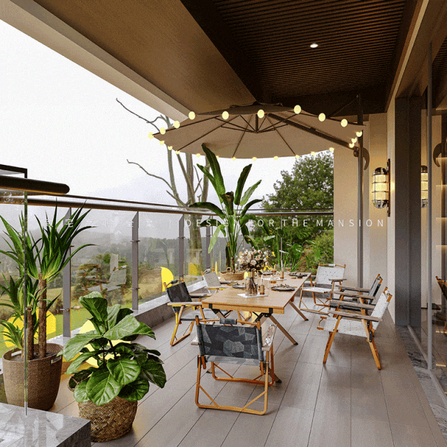 窗景也是傲云天府的隐形财富,与客厅相连的景观阳台,我们没有选择封窗,通过防腐木地面和木饰面吊顶,配合露营椅、蛋卷桌、多重氛围灯,加上葱郁的绿植环绕,窗外和身边双重贴近自然,边泡茶边聊天,在家也能体验户外露营的惬意!