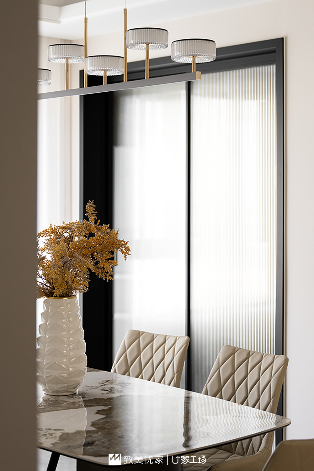 满足餐边的日常收纳需求,在靠近厨房的一侧设计师还结合全屋风格选配了一个现代感的收纳斗柜,融合抽屉与玻璃柜门的分割方式避免了这面墙体的视觉呆板,让餐区日常整理起来也更加方便快捷。