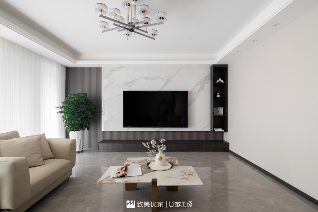 电视背景墙以简洁的黑白灰为主,结合岩板材料与开放格设计了视觉造型,下方落地的电视柜方便收纳遥控器、路由器等复杂线路的同时也可以摆放书籍和艺术饰品。
