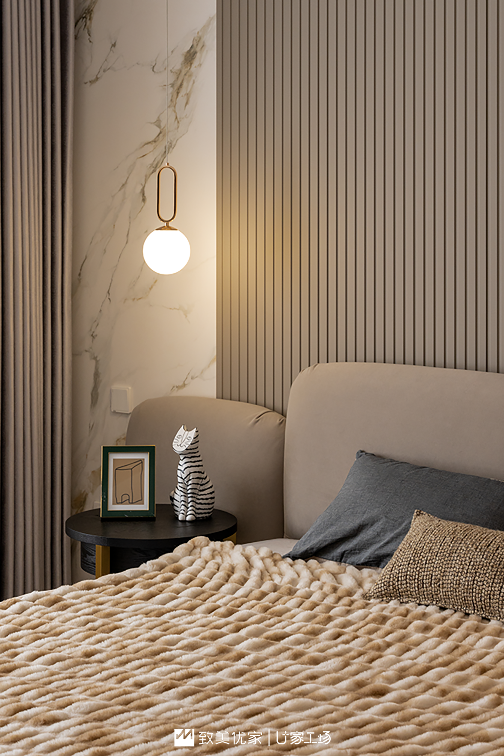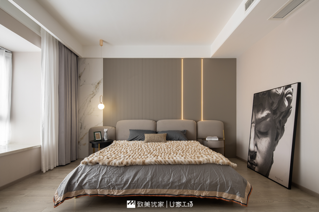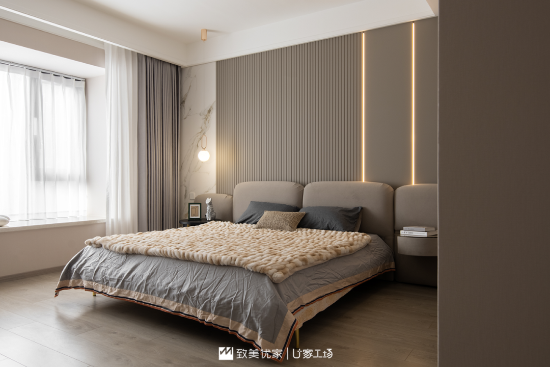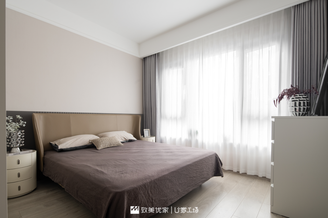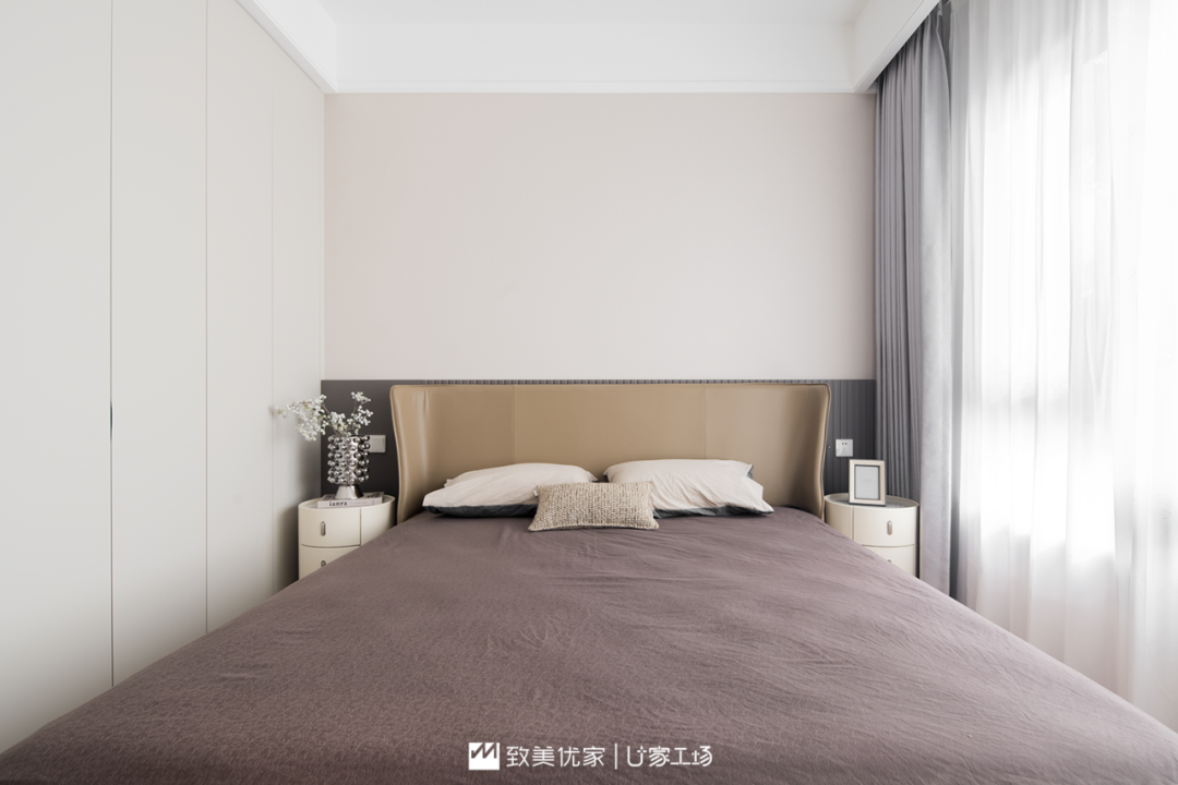 背景墙为增加层次感还单独加装了护墙板,而双层窗帘的叠加设计让室内隐私性变得更强,平时只拉上纱帘也能获得窗外自然柔和的采光。