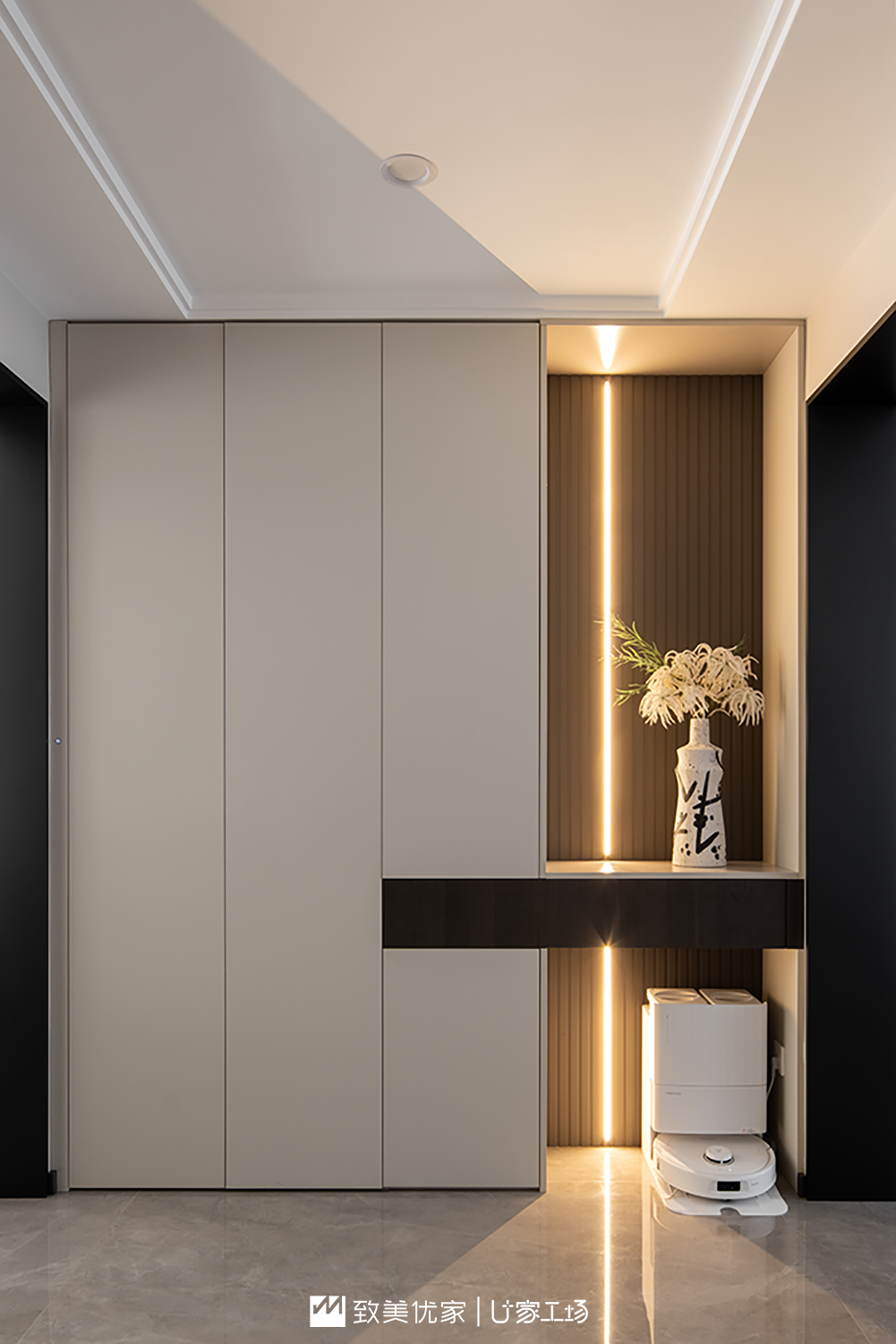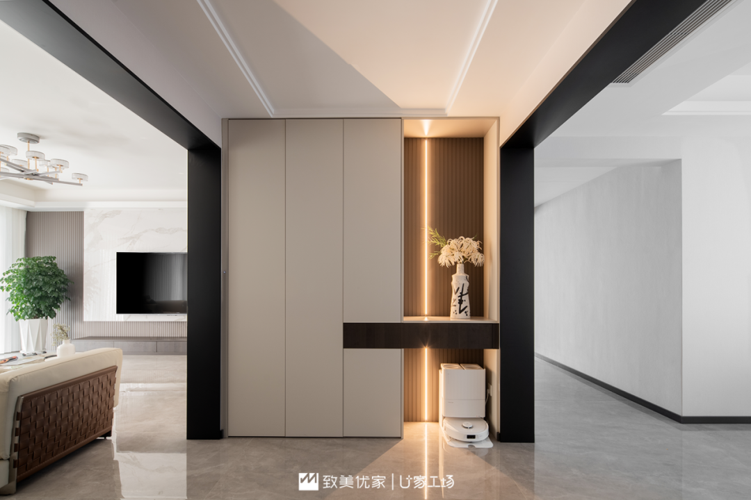 为避免入户视觉的压迫性,右侧利用格栅材质和灯带元素来调和视线重心,黑色隔断台面一分为二的处理方式为景观展示和扫地机器人的收纳也搭建出了适宜空间。